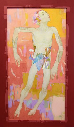 During his entire career, Didebashvili worked with both figurative and abstract painting, and in the end he merged two practices together in his late mature portraits. In his practice Mamuka employs the intricate and demanding layered Flemish painting technique that was used by the old masters of the Northern Renaissance. At first, Mamuka’s characters seem to resemble the ones of the Flemish masters, but because of the bright colours and the abstract background, Didebashvili’s characters seem to be taken out of any time or georgraphic context.