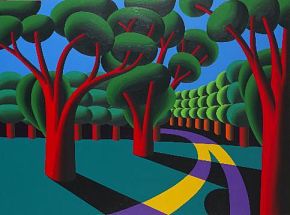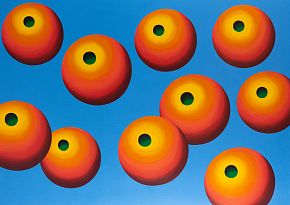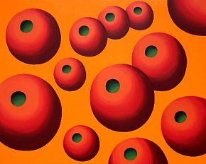Oleg Khvostov uses themes from traditional painting genres — landscapes, still-lifes, portraits, multi-figured compositions — but also includes numerous "remakes" of world-famous works of art, from Leonardo to Jeff Koons. Nonetheless, his characteristic method of consciously simplifying form, freeing it from excess detail, and giving underscored roundness and cylindricity to shapes, in conjunction with his bold colors and large canvases, make his artistic manner original and easily identifiable. His use of a vivid, contrastive color palette and his deliberate simplicity imbue the artist's works with the decorative effect and irony of pop art.