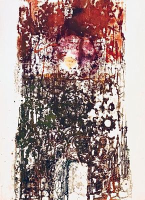 His art is a strange combination of high aestheticism and folk «roots», modernistic extravaganza and dadaistic fragility, symbolic botomlessness and Russian bast print metaphysics, artistic refinement and graphic roughness. But even all of those put together do not make his art unprofessional or eclectic. Rather, it transmits giant spiritual experience and marks the beginning of the sacred, the mysterious, the beginning of all beginnings.