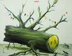 His creative work is not limited by the city space, he paints in oils on canvas and creates installations, keeping his own visual system not depending on the techniques.