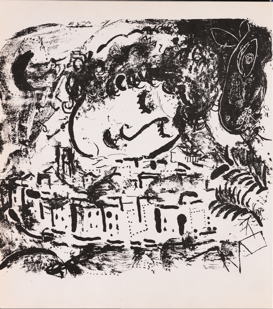 Работа из серии "Лессен" Среди мастеров живописи ХХ века Марк Шагал не был единственным, кто обратился к литографии. Но был одним из немногих, кто овладел ею в совершенстве и использовал эту печатную технику как способ самовыражения и проявления своего отношения к мирозданию. Его литографии составляют бесконечный исповедальный цикл, состоящий из серий и отдельных листов. Наделенный уникальным даром слова, художник ярко и образно написал о печатной графике как о своем способе мыслить и жить. Свои гравюры мастер печатал в знаменитой парижской мастерской Фернана Мурло при непосредственном участии известного литографа Шарля Сорлье. Данная литография входит в цикл работ "Шагал". Серия автобиографичных зарисовок создана совместно с известным искусствоведом и другом художника Жаком Лэссеном. Издательство :Mourlot Freres/Paris Документация/ссылка: CRAMER 34