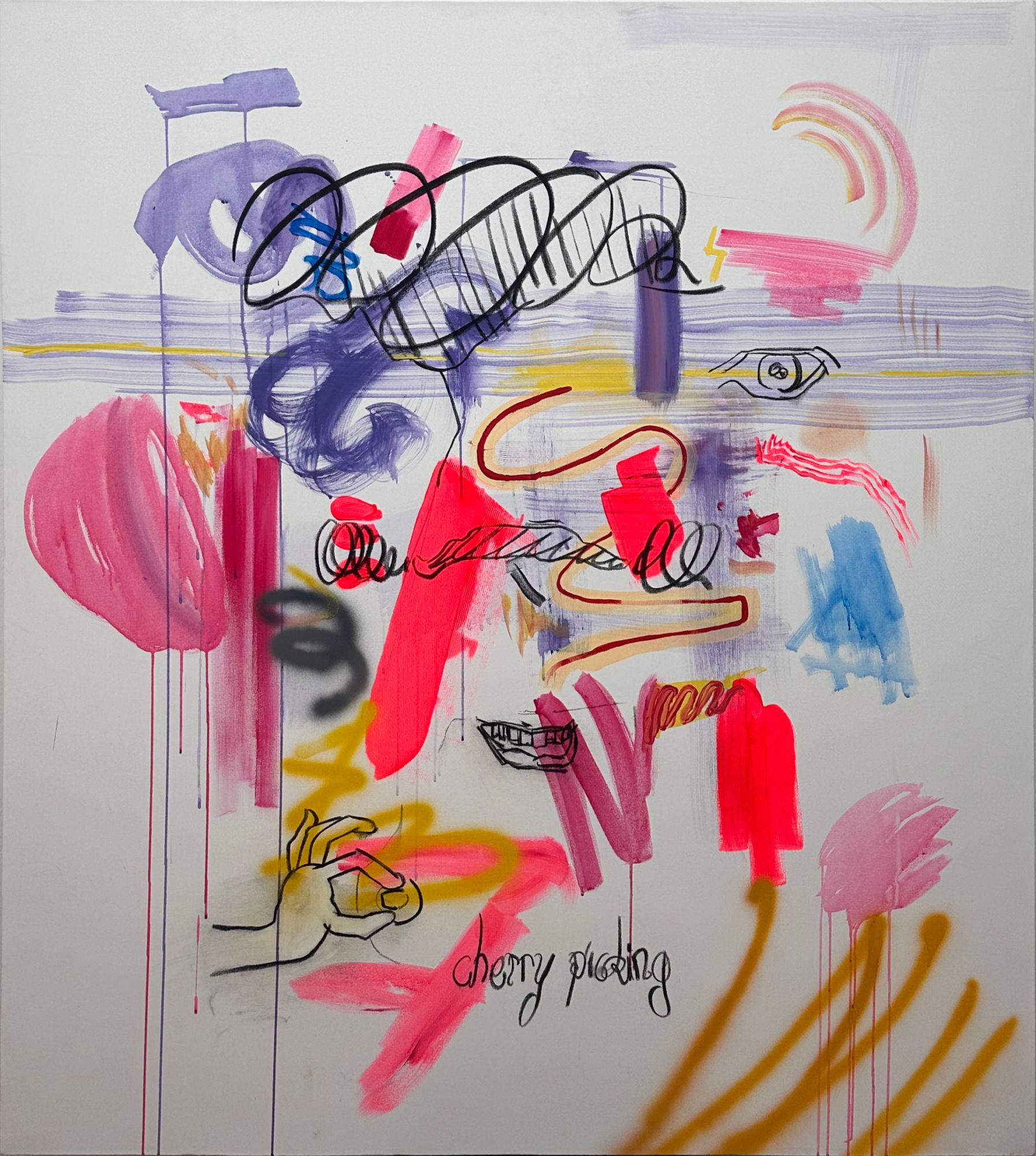 Materials: acrylic, charcoal pencil, spray paint on canvas