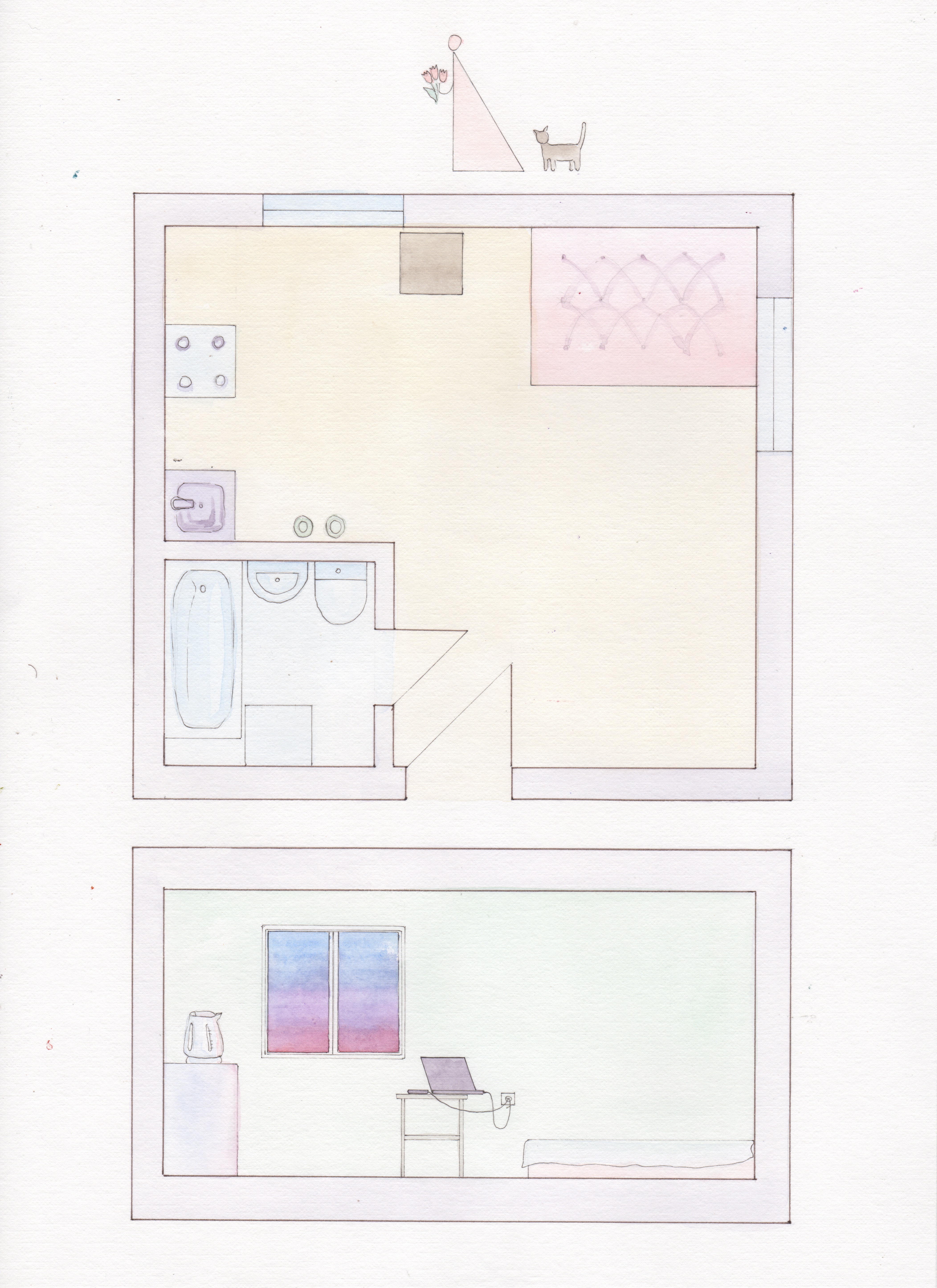 A series of graphics and architectural drawings were created for the social sculpture "Odnushka" (One-room apartment). This work was implemented in 2019 as part of the project" On the District/NA RAjONE", initiated by the Austrian Cultural Forum.