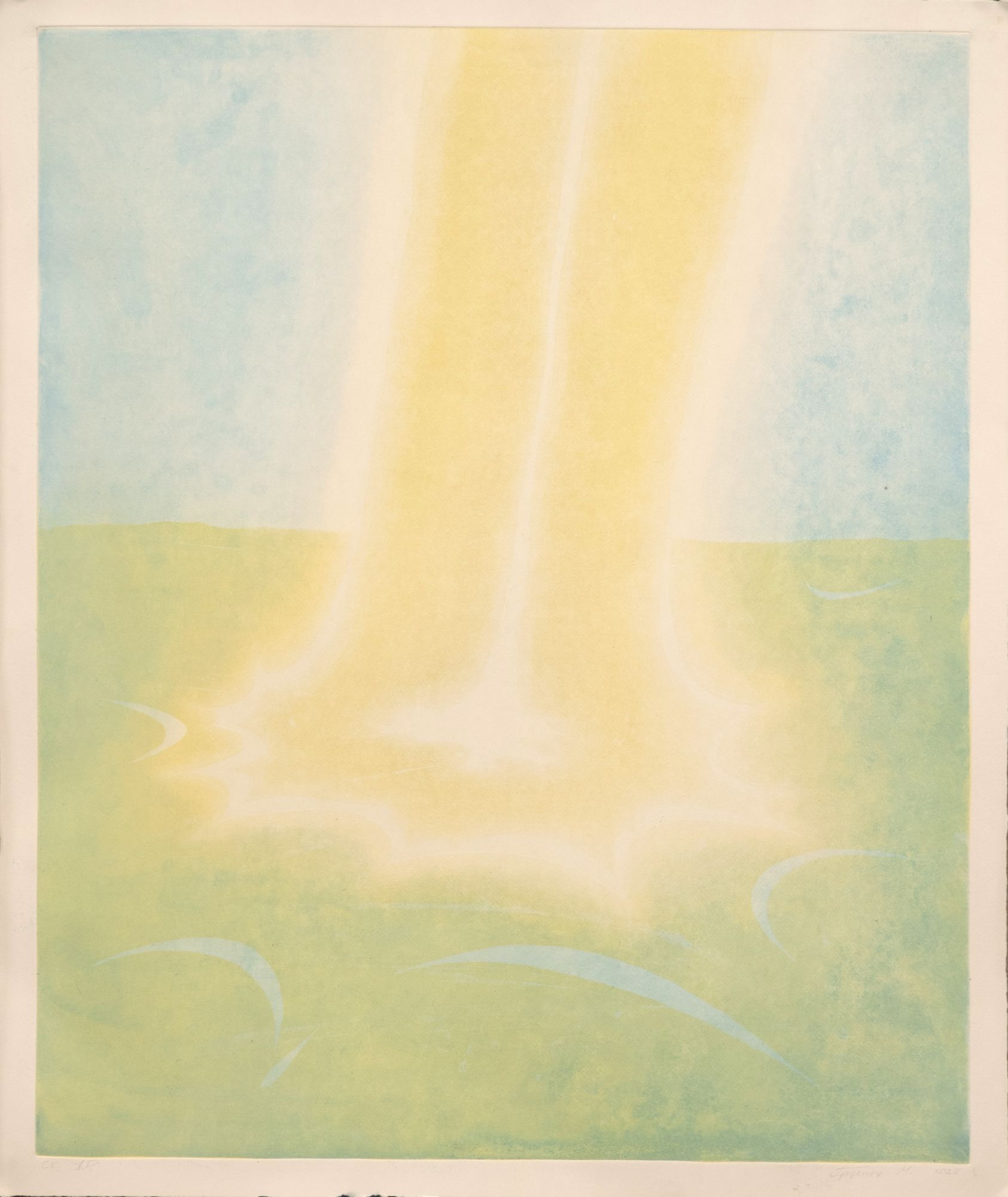 Серия выполнена в технике цветного офорта и акватинты — печатной графики, позволяющей работать с мягким тоном и пятном, создавая эффект, напоминающий заливку акварелью или тушью. Свет, словно льющийся изнутри, становится метафорой любви, наполняющей пространство, а тёплая цветовая гамма усиливает это ощущение мягкого, рассеянного сияния. Пейзажи приобретают черты ирреальности: они лишены конкретности и существуют как пространства переживания, в которых внутреннее состояние переводится в визуальную форму.