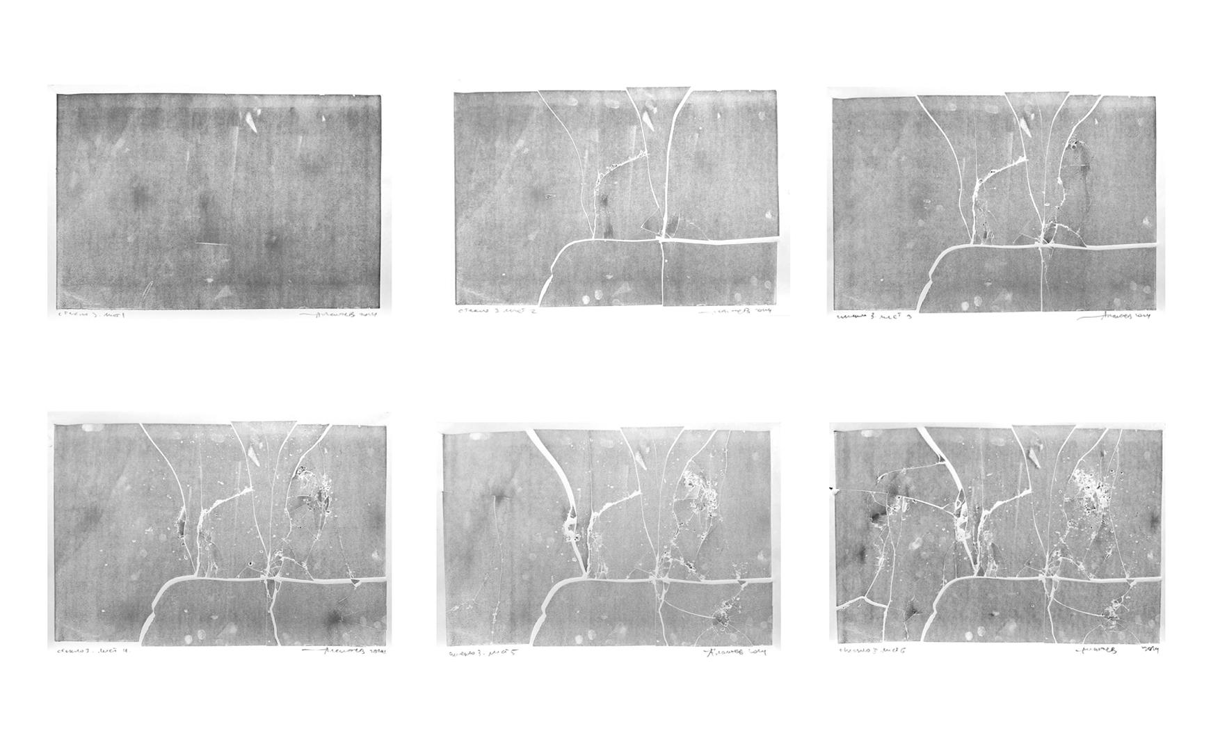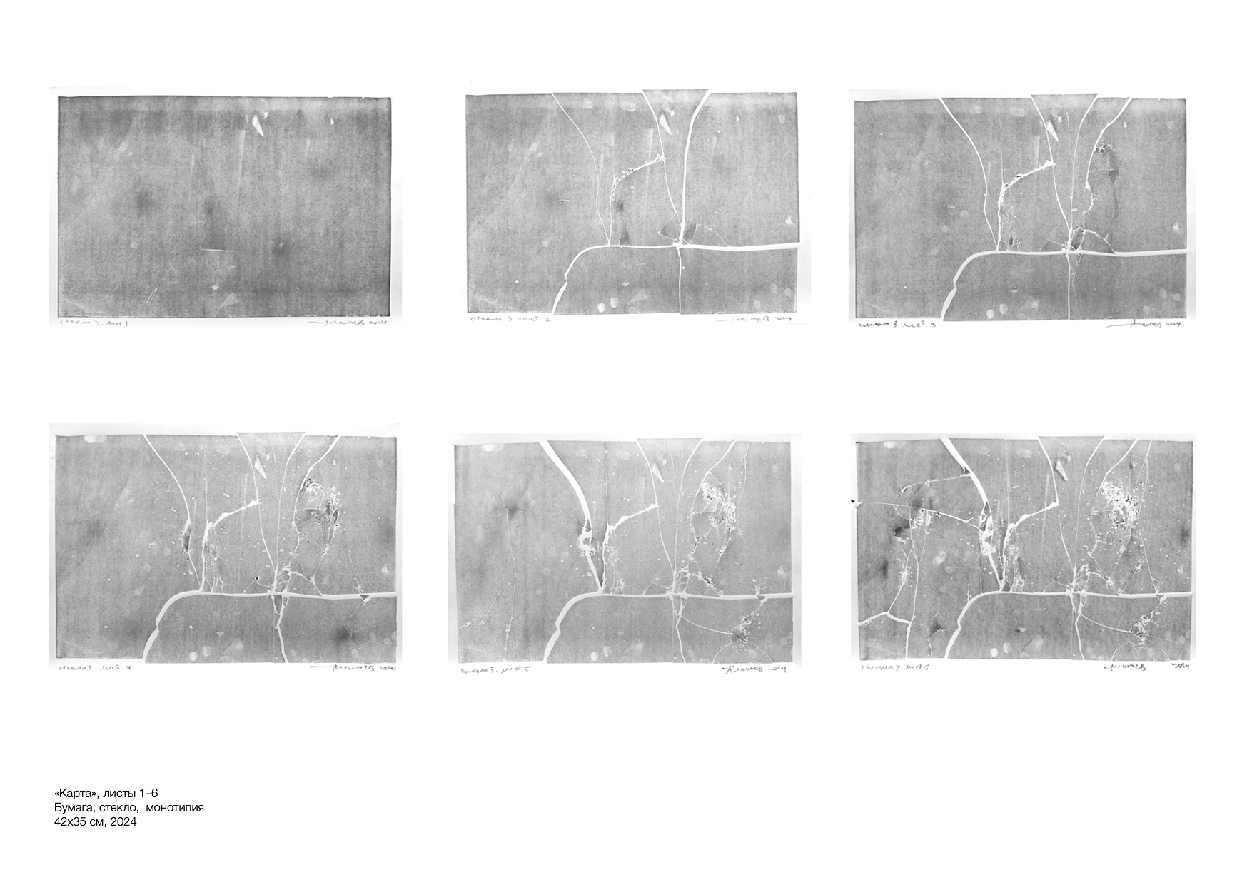 Листовое стекло используется как печатная форма для оттискивания на бумаге: на него накатывалось небольшое количество краски, далее при прокатывании в офортном станке оно трескалось и, отпечатывая своё новое, преобразованное состояние, «фиксировалось» на листе, создавая нечто, близкое к карте, со своими путями разной толщины, складками, трещинками и маленькими осколками, которые буквально впечатывались в бумагу.
