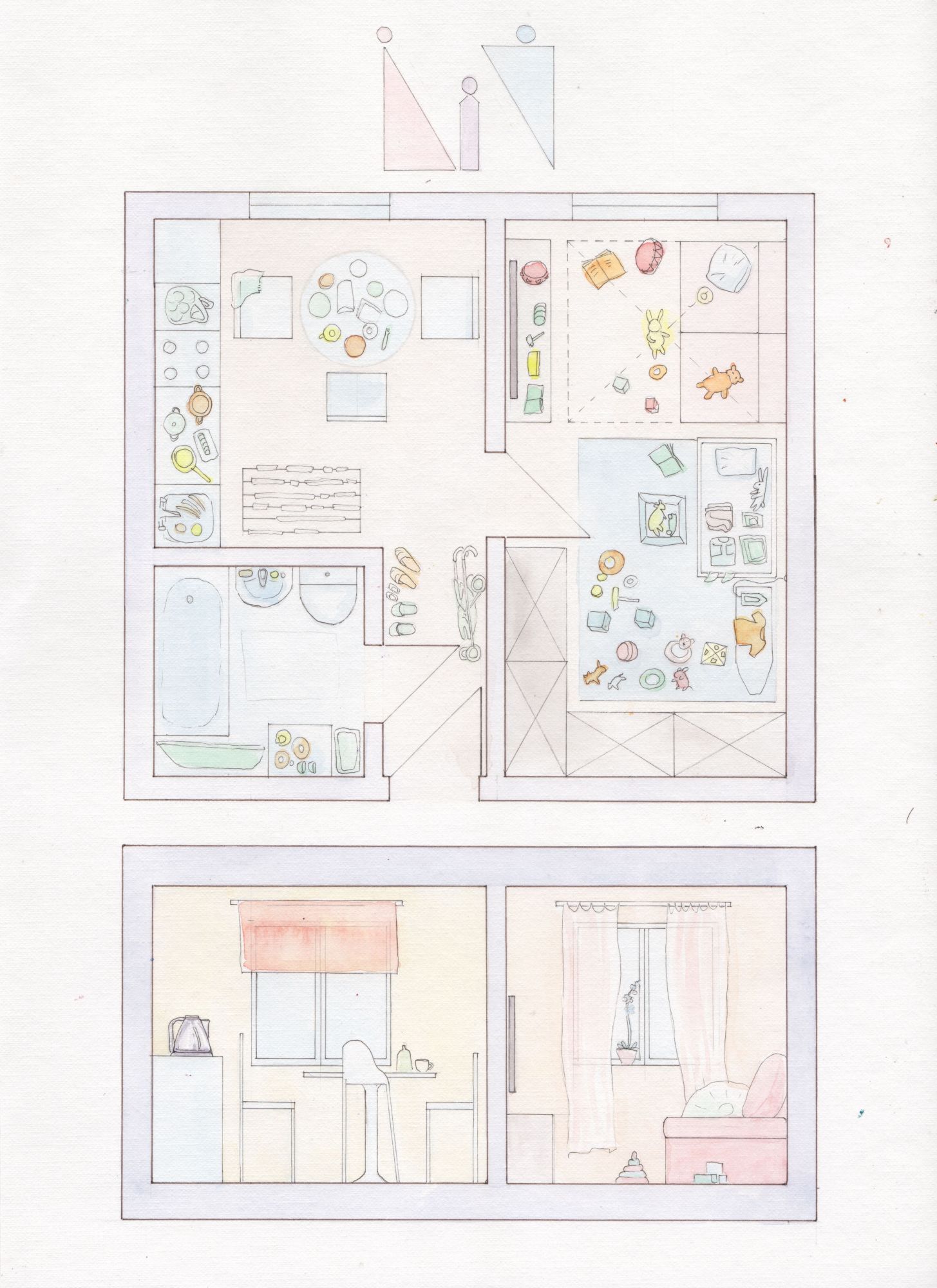 A series of graphics and architectural drawings were created for the social sculpture "Odnushka" (One-room apartment). This work was implemented in 2019 as part of the project" On the District/NA RAjONE", initiated by the Austrian Cultural Forum.