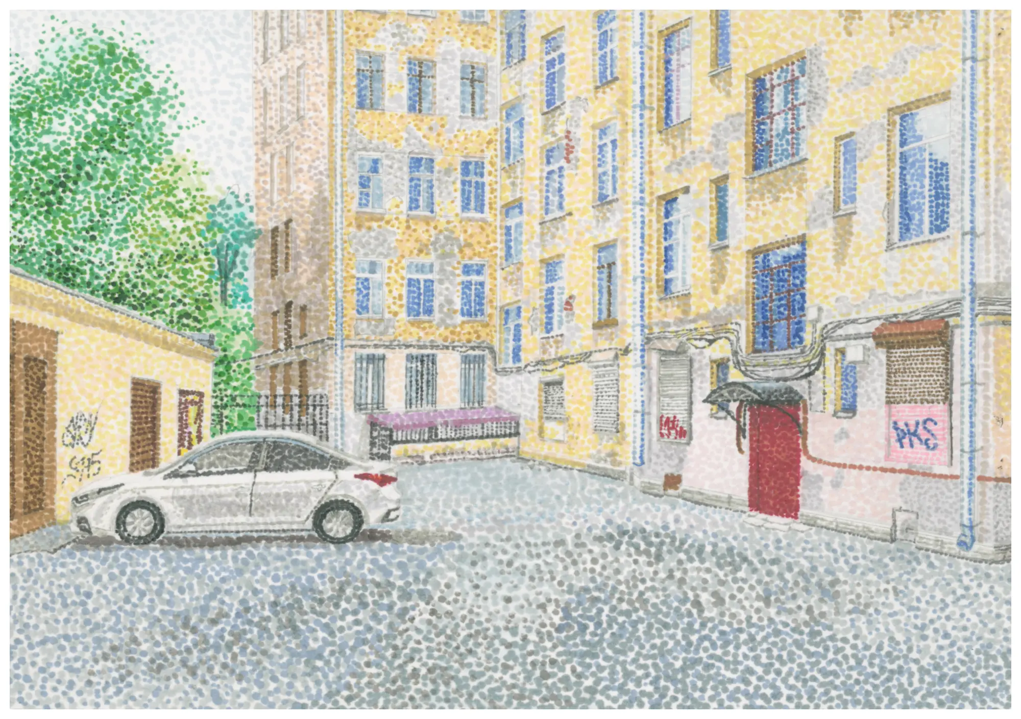 Люба Образцова переизобретает пуантилизм, раскладывая окружающий ее мир на атомы. Люба окончила художественное училище им. Рериха и успела поработать реставратором. Теоретическую базу Обрзацова добирала в Академии Художеств. С 2020 года входит в состав Новых городских художников. К наиболее ярким работам художницы относятся точечные серии графических листов. Серия «По дороге в диспансер» погружает в неспешную прогулку по обшарпанным дворам. В рамках издательского проекта AMINAZINE (который получил поддержку фонда Cosmoscow) был издан зин с «прогулкой», который теперь можно встретить во многих музейных библиотеках – от Гаража до Центра Помпиду. Еще одна серия, посвященная непарадному Нижнему Новгороду, появилась в 2025 году по итогам участия художницы в программе нижегородских арт-резиденций. Часть работ была представлена на Cosmoscow и полностью распродана в день превью. Также эти работы успели засветиться в галерее Пальто.
