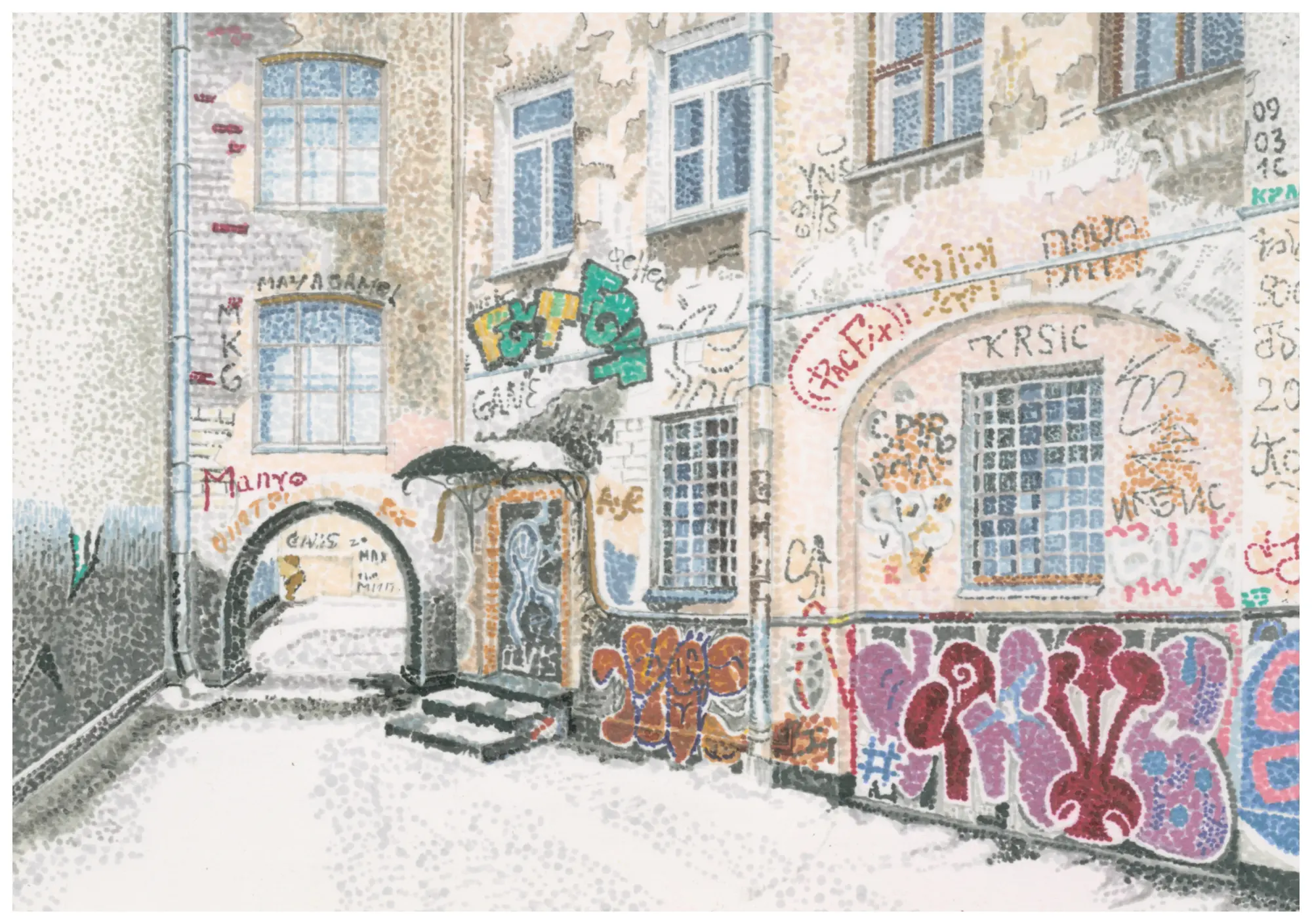 Люба Образцова переизобретает пуантилизм, раскладывая окружающий ее мир на атомы. Люба окончила художественное училище им. Рериха и успела поработать реставратором. Теоретическую базу Обрзацова добирала в Академии Художеств. С 2020 года входит в состав Новых городских художников. К наиболее ярким работам художницы относятся точечные серии графических листов. Серия «По дороге в диспансер» погружает в неспешную прогулку по обшарпанным дворам. В рамках издательского проекта AMINAZINE (который получил поддержку фонда Cosmoscow) был издан зин с «прогулкой», который теперь можно встретить во многих музейных библиотеках – от Гаража до Центра Помпиду. Еще одна серия, посвященная непарадному Нижнему Новгороду, появилась в 2025 году по итогам участия художницы в программе нижегородских арт-резиденций. Часть работ была представлена на Cosmoscow и полностью распродана в день превью. Также эти работы успели засветиться в галерее Пальто.