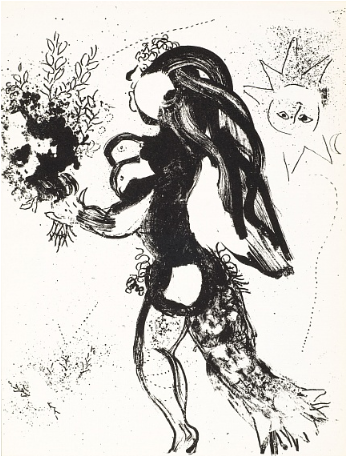 Оригинальная литография из серии "Chagall, Lithographs I", посвященной основным темам творчества Марка Шагала, таким, как любовь, семья, Витебск, Париж, Библия, цирк. Выполнена в студии Mourlot Frères, Paris; издана Andre Sauret, Paris.