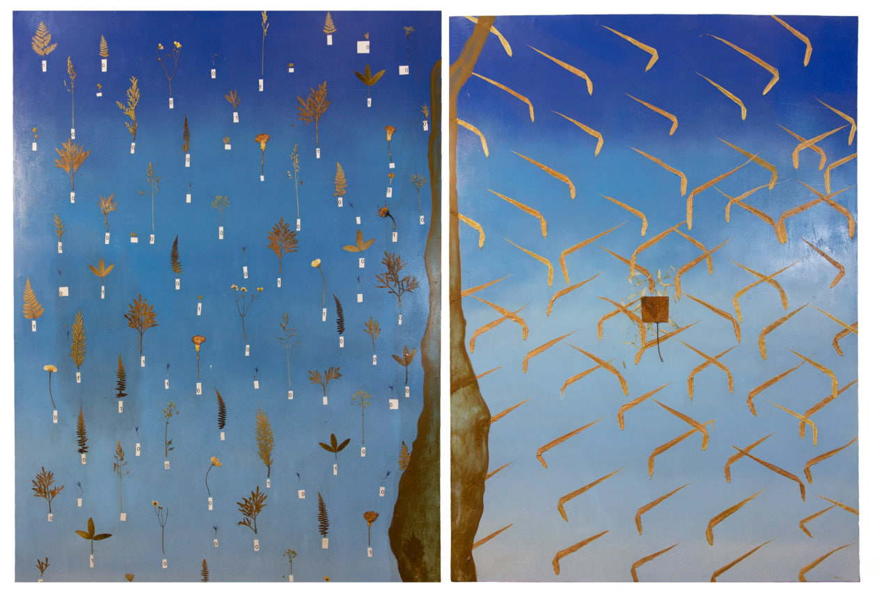 Антон Шульгин часто работает в технике коллажа используя в качестве основного материала фрагменты цветов и растений (или их сок).