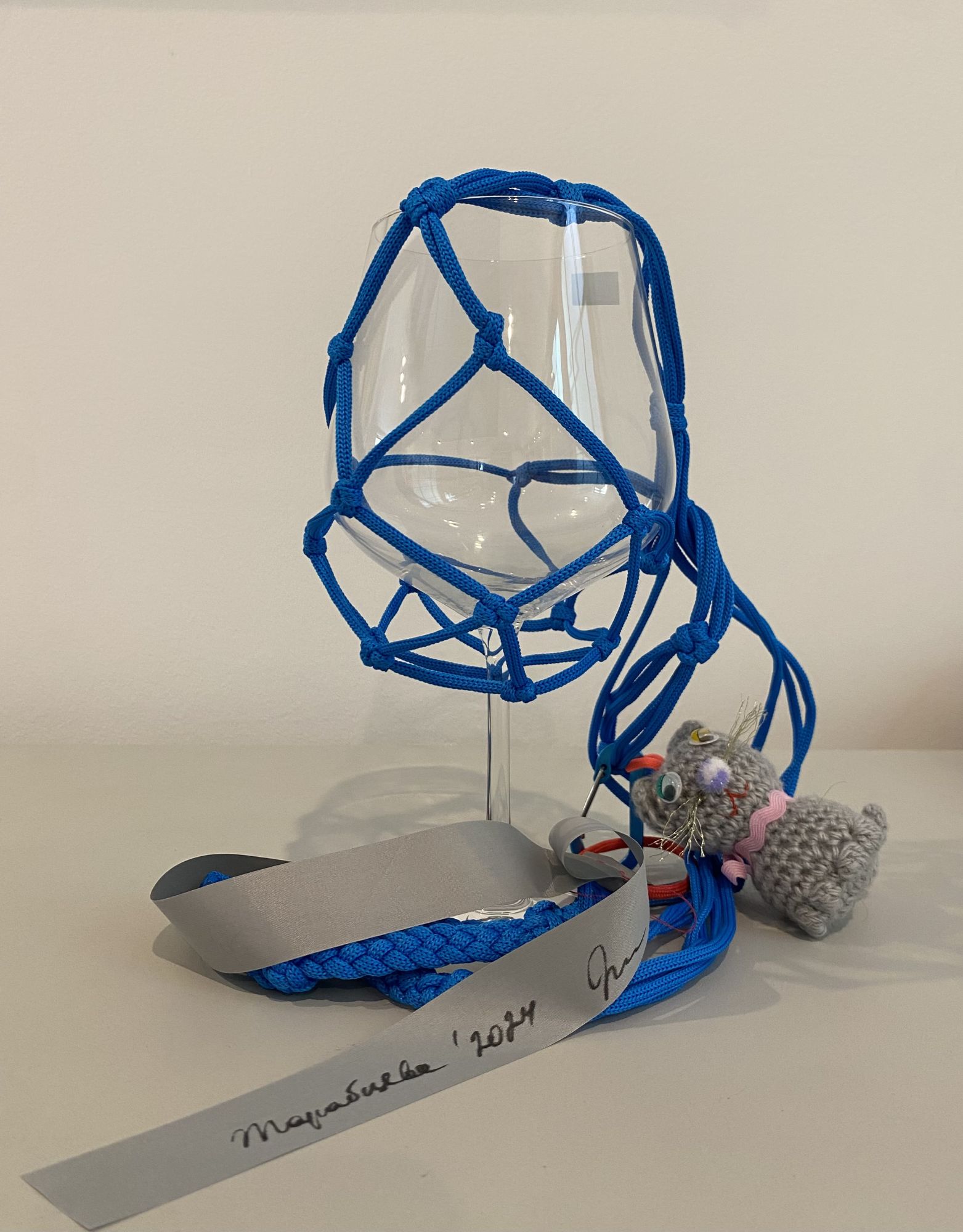 Тара Тарабцева работает с современной ручной и ковровой вышивкой, шитьем, графикой и объектами. Каждый бокал из ее серии «В мой стакан с вином, Ласточки, не роняйте Комочки земли» помещен в специальную сумочку, которая сплетена традиционным азиатским узлом «Лотос». Как отмечает художница, это сетка-оберег, чтобы напиток не отравили и не сглазили. Ту же функцию защиты несут ленточки и зверьки.