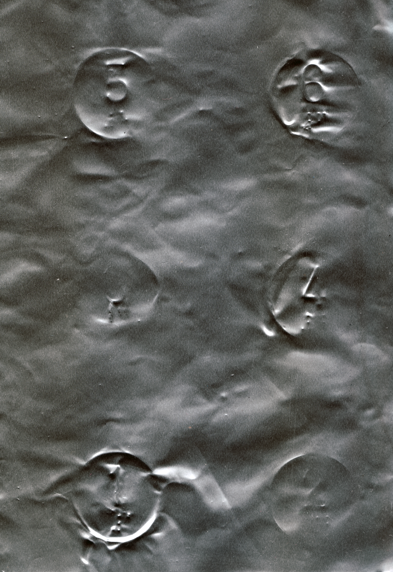 Всем знакомые кнопочные панели из переходного места — лифта , сняты с помощью чеканной фольги с разной силой давления. Если кнопка - это метафора действия, то проваливающиеся в материал и растворяющиеся в нем объекты - сюрреалистическая невозможность взаимодействия, увеличенная до пугающего, несоразмерного формата.