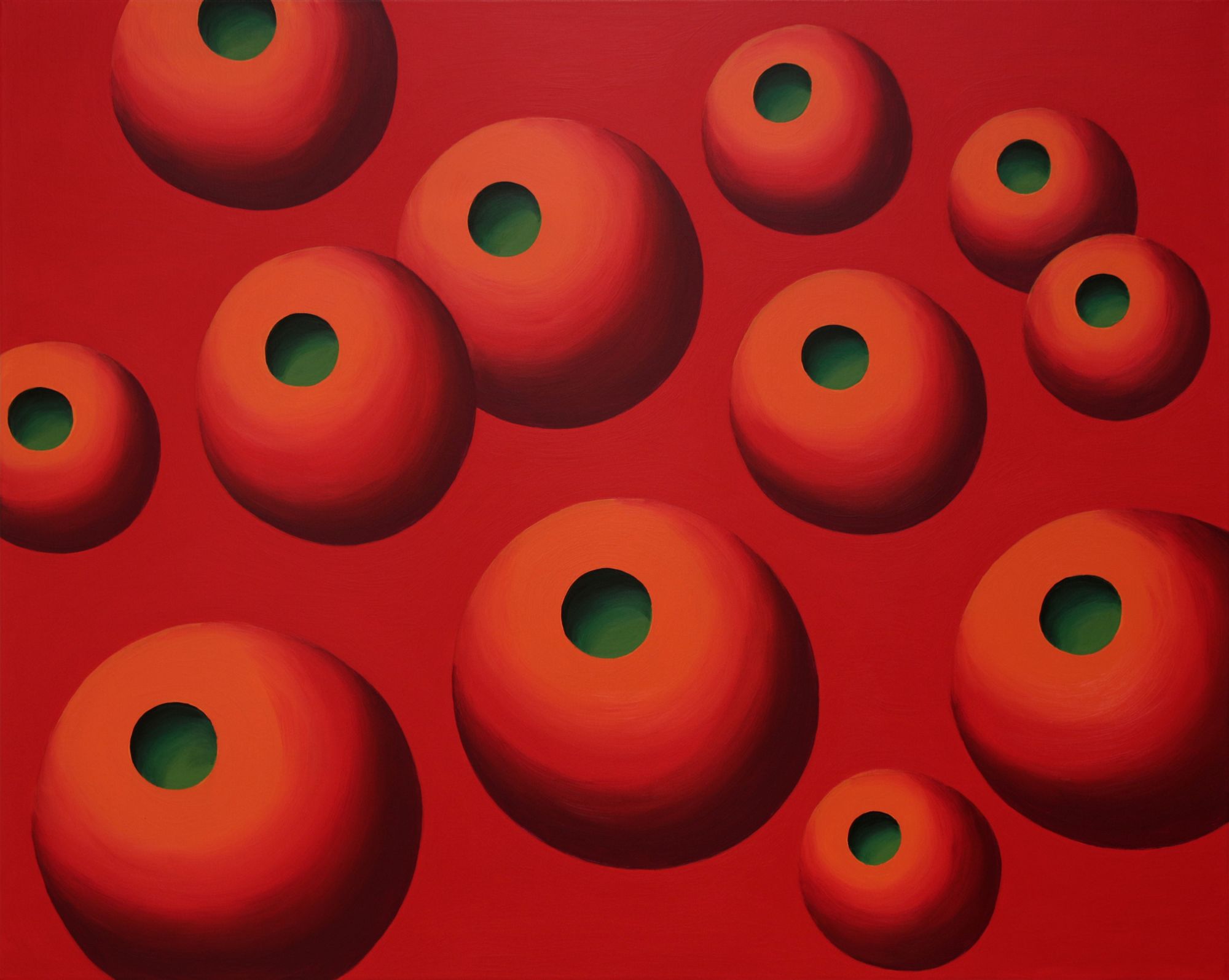 Oleg Khvostov uses themes from traditional painting genres — landscapes, still-lifes, portraits, multi-figured compositions — but also includes numerous "remakes" of world-famous works of art, from Leonardo to Jeff Koons. Nonetheless, his characteristic method of consciously simplifying form, freeing it from excess detail, and giving underscored roundness and cylindricity to shapes, in conjunction with his bold colors and large canvases, make his artistic manner original and easily identifiable. His use of a vivid, contrastive color palette and his deliberate simplicity imbue the artist's works with the decorative effect and irony of pop art.