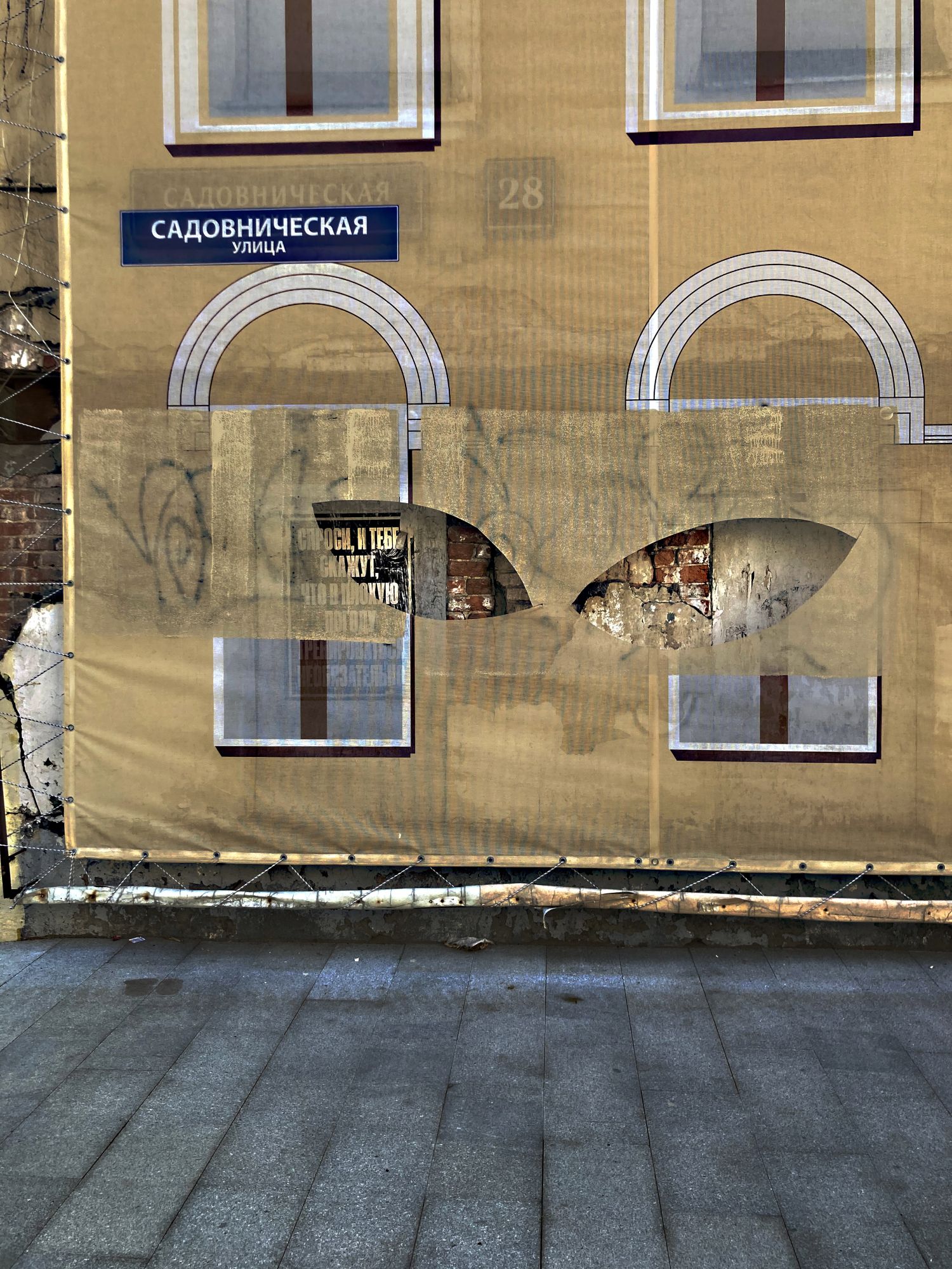 Kirill Lebedev (Kto) is something of a cult figure within Moscow’s street art subculture, contributing immensely not only through his diverse work as an artist, but also as one of the few theorists and curators of street art. In his efforts to create a more self-conscious, intelligent, and meaningful culture for the streets, Lebedev has systematically declared war on hollow practices such as tagging and purposeless graffiti, while continually questioning and revisiting his own beliefs and convictions as an artist. His recent works are often dark and pessimistic messages executed in psychedelic patchworks of color, and are at once uplifting and disquieting. For the Moscow Garage Triennial in 2017, Lebedev created a monumental work on a wall of the Gorky Park administration building. The wall that has been made available to him for this purpose is one he says he has been interested in for a while. The wall is strange in that it includes two sets of stairs leading nowhere, the doorways having long been sealed. Ladders are a longtime passion for Lebedev, and Muscovites may remember the strange ladder-insect creature that has slowly crawled the walls of the city since 2001. The artist explains with affection how this creature spends its life crawling upwards and discovering new territories and, when it dies, its body fossilizes and others can use it as a bridge.