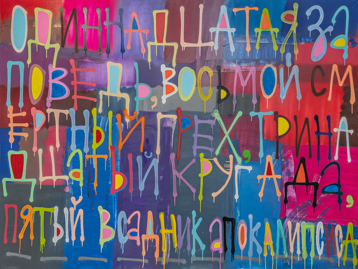 Kirill Lebedev (Kto) is something of a cult figure within Moscow’s street art subculture, contributing immensely not only through his diverse work as an artist, but also as one of the few theorists and curators of street art. In his efforts to create a more self-conscious, intelligent, and meaningful culture for the streets, Lebedev has systematically declared war on hollow practices such as tagging and purposeless graffiti, while continually questioning and revisiting his own beliefs and convictions as an artist. His recent works are often dark and pessimistic messages executed in psychedelic patchworks of color, and are at once uplifting and disquieting. For the Moscow Garage Triennial in 2017, Lebedev created a monumental work on a wall of the Gorky Park administration building. The wall that has been made available to him for this purpose is one he says he has been interested in for a while. The wall is strange in that it includes two sets of stairs leading nowhere, the doorways having long been sealed. Ladders are a longtime passion for Lebedev, and Muscovites may remember the strange ladder-insect creature that has slowly crawled the walls of the city since 2001. The artist explains with affection how this creature spends its life crawling upwards and discovering new territories and, when it dies, its body fossilizes and others can use it as a bridge.