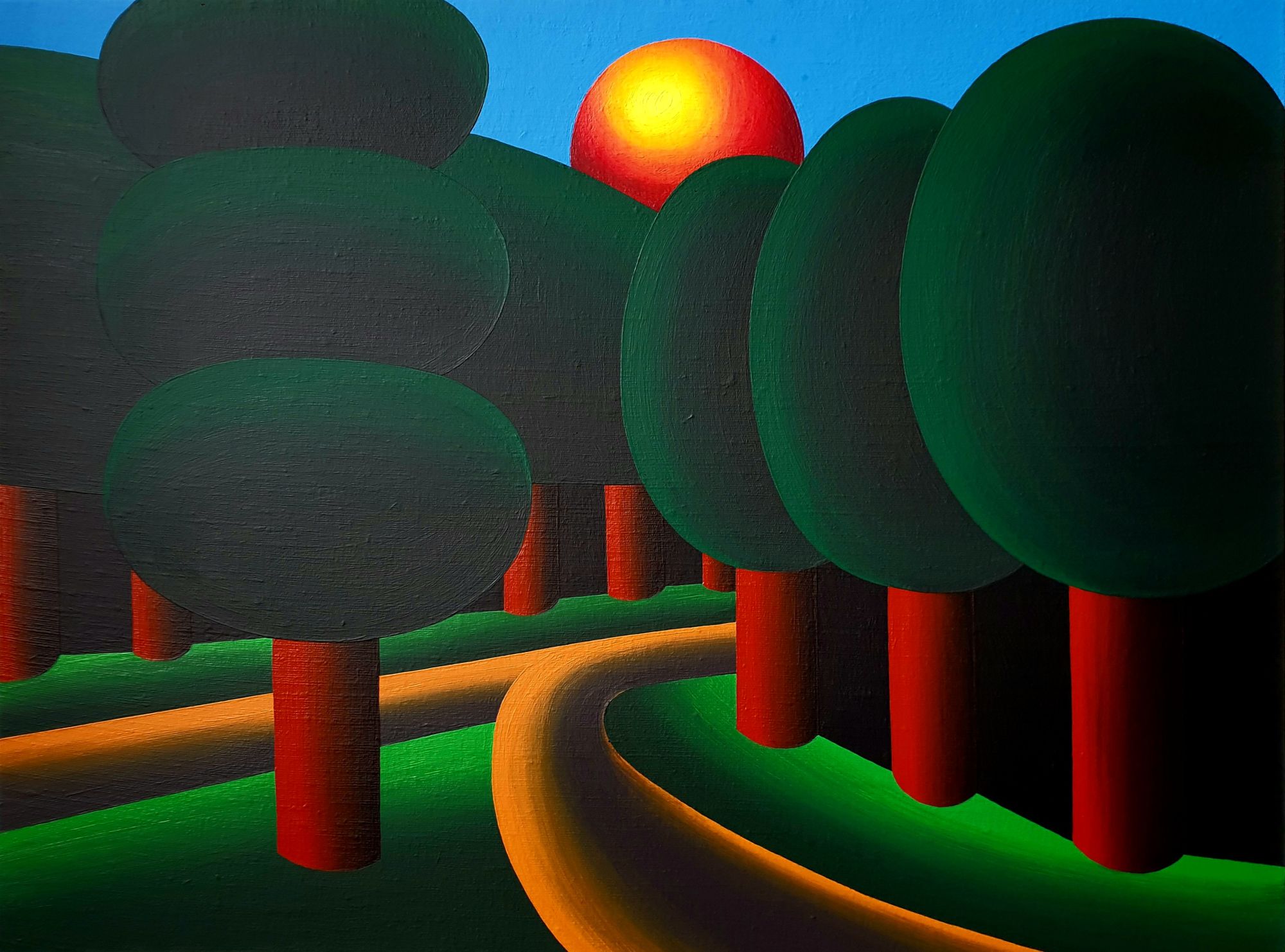 Oleg Khvostov uses themes from traditional painting genres — landscapes, still-lifes, portraits, multi-figured compositions — but also includes numerous "remakes" of world-famous works of art, from Leonardo to Jeff Koons. Nonetheless, his characteristic method of consciously simplifying form, freeing it from excess detail, and giving underscored roundness and cylindricity to shapes, in conjunction with his bold colors and large canvases, make his artistic manner original and easily identifiable. His use of a vivid, contrastive color palette and his deliberate simplicity imbue the artist's works with the decorative effect and irony of pop art.