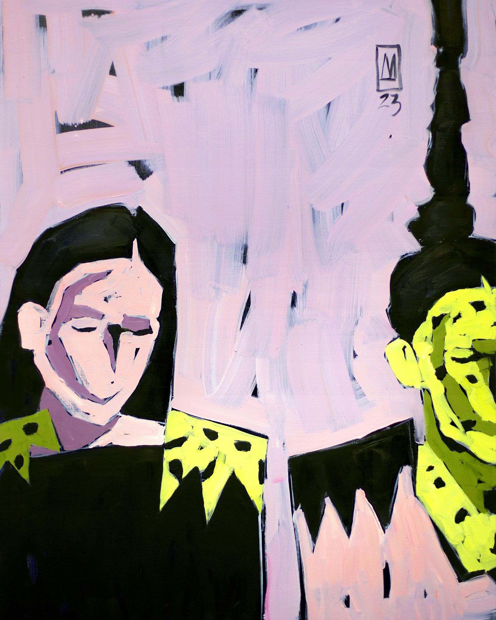 Anastasiia Danilenko is a graphic designer. But the area of her occupation is painting, and, moreover, such a traditional painting genre as a portrait. Although it cannot be called traditional in Danilenko's intentions. “I write images and forms. Color spots and lines. My characters have their eyes closed. Without looking into a person's eyes, we are able to see much more” - says the artist. Her portraits capture herself and her relationship with the world. Anastasiia Danilenko's portraits are confessional, regardless from the most imprinted image.Artist is not concerned about the specific appearance a lot, as the very essence of the shell that hides a person in itself. In waist portraits, the figurative load is carried by the gesture and the general position of the body itself. Anastasiia Danilenko always starts with black, painting over the entire surface of the canvas with black paint and writes on it with her favorite range of green and pink colors. The colors seem saturated on the black underdrawing, the image has a black contour and a rigid structure.Out of this black nothingness and subconscious Anastasiia, as a sculptor, carves alluring and catchy images full of her frankness.