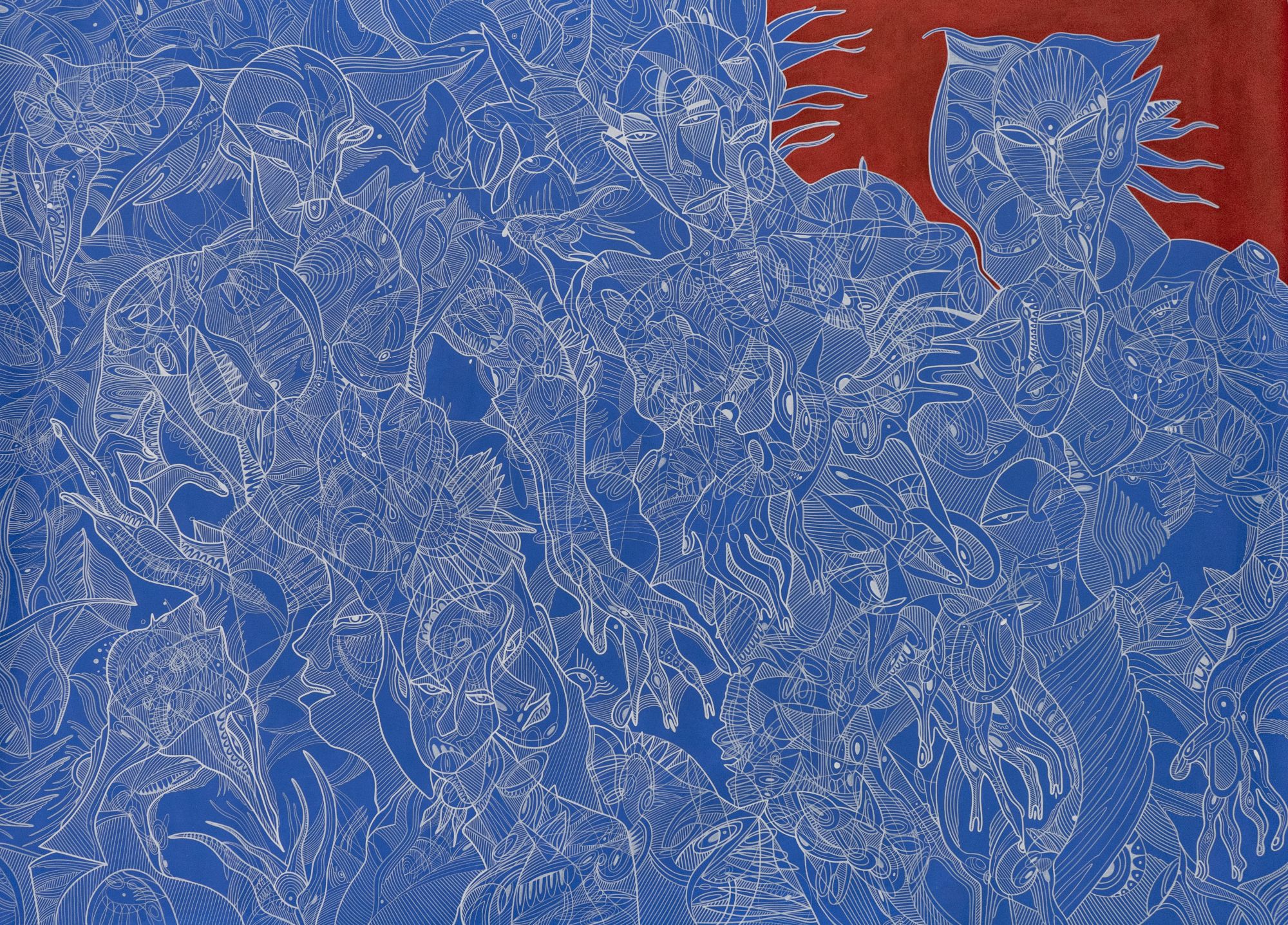 For Aubekerov, the surface of the canvas does not tolerate emptiness, and must be completely filled. With no beginning and no end, his lines multiply, weaving into complex patterns similar to those made by plants or bacteria. The movements of his hand along the surface become complex non-linear journeys for the viewer’s eye in space. The images fill as much of the surface as possible, like flora. In creating these structures, the artist manipulates an enormous number of visual quotes – from Paul Klee and Henri Matisse to Jean-Michel Basquiat, Keith Haring, and even M. C. Escher – and combines the complicated methods of structuring picture space used by all of these artists with oriental ornamentation, his own eastern identity.