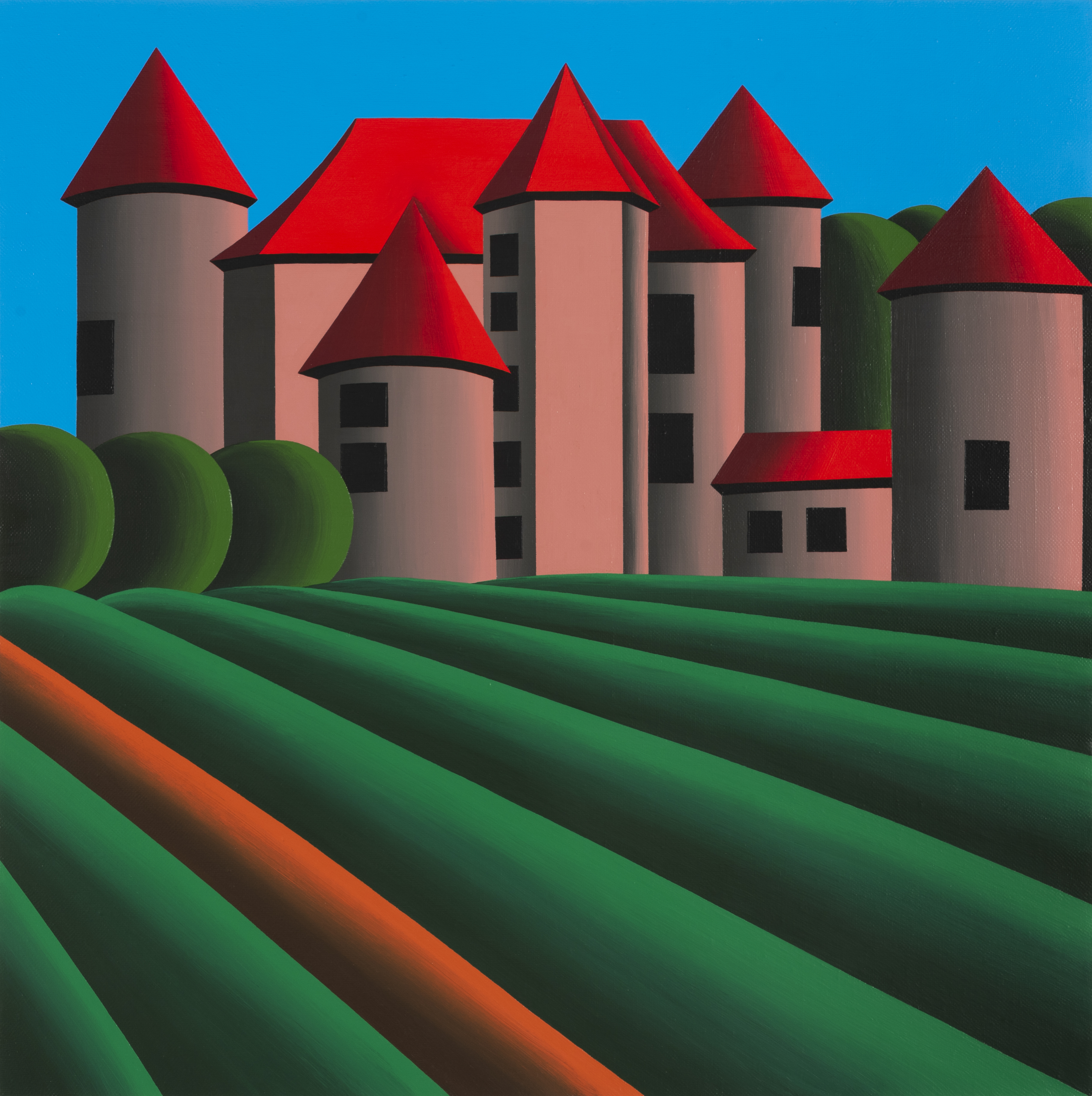 Oleg Khvostov uses themes from traditional painting genres — landscapes, still-lifes, portraits, multi-figured compositions — but also includes numerous "remakes" of world-famous works of art, from Leonardo to Jeff Koons. Nonetheless, his characteristic method of consciously simplifying form, freeing it from excess detail, and giving underscored roundness and cylindricity to shapes, in conjunction with his bold colors and large canvases, make his artistic manner original and easily identifiable. His use of a vivid, contrastive color palette and his deliberate simplicity imbue the artist's works with the decorative effect and irony of pop art.