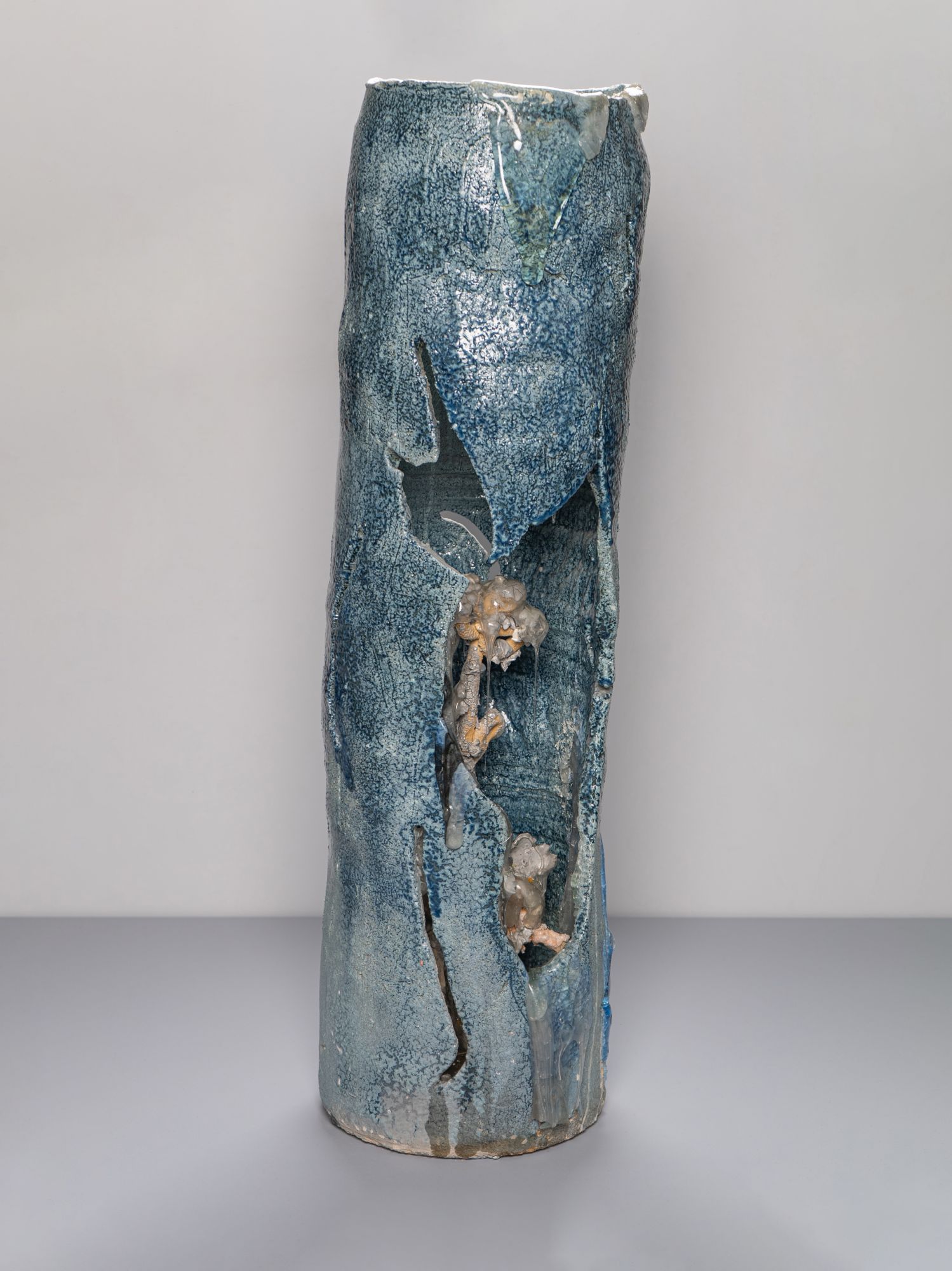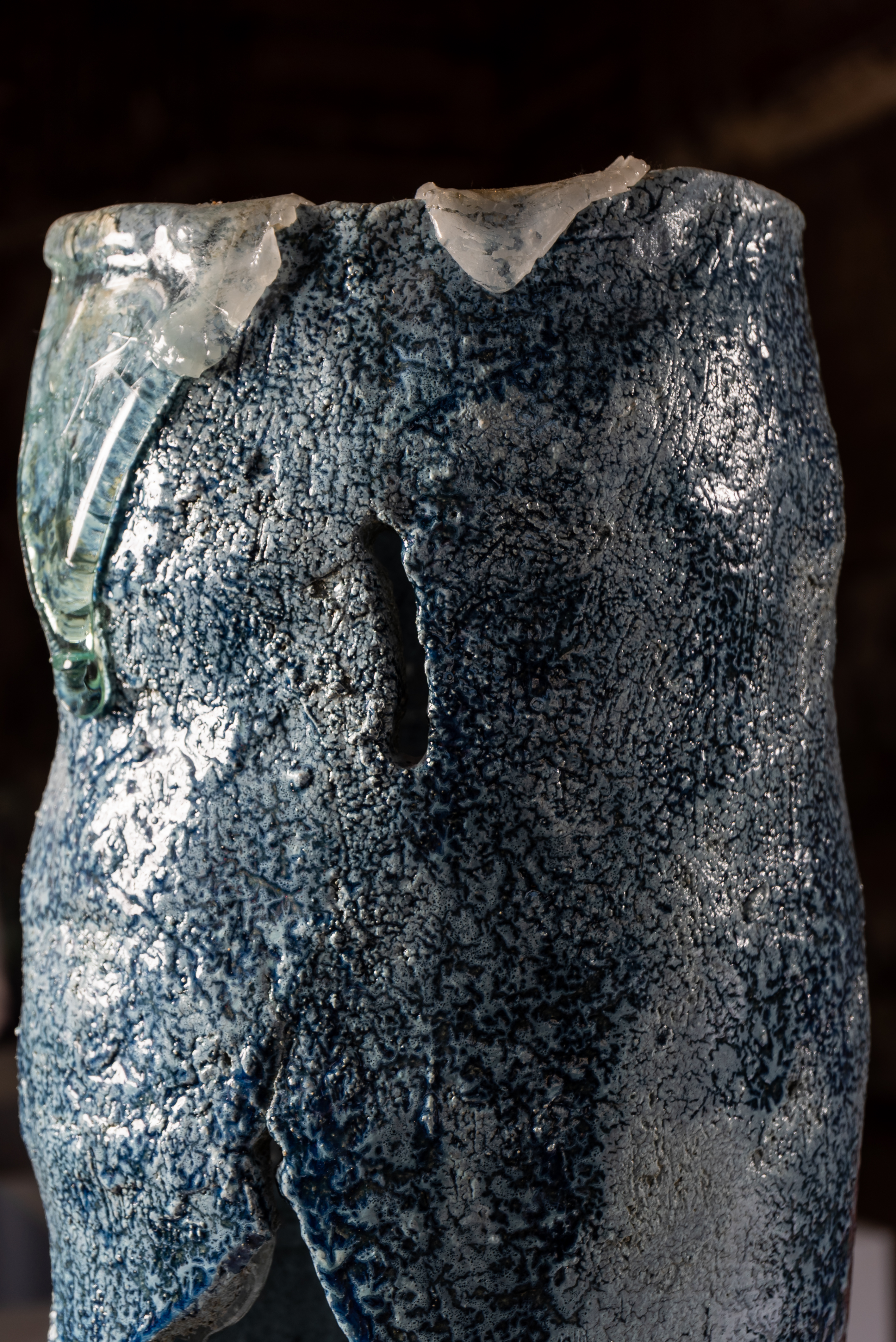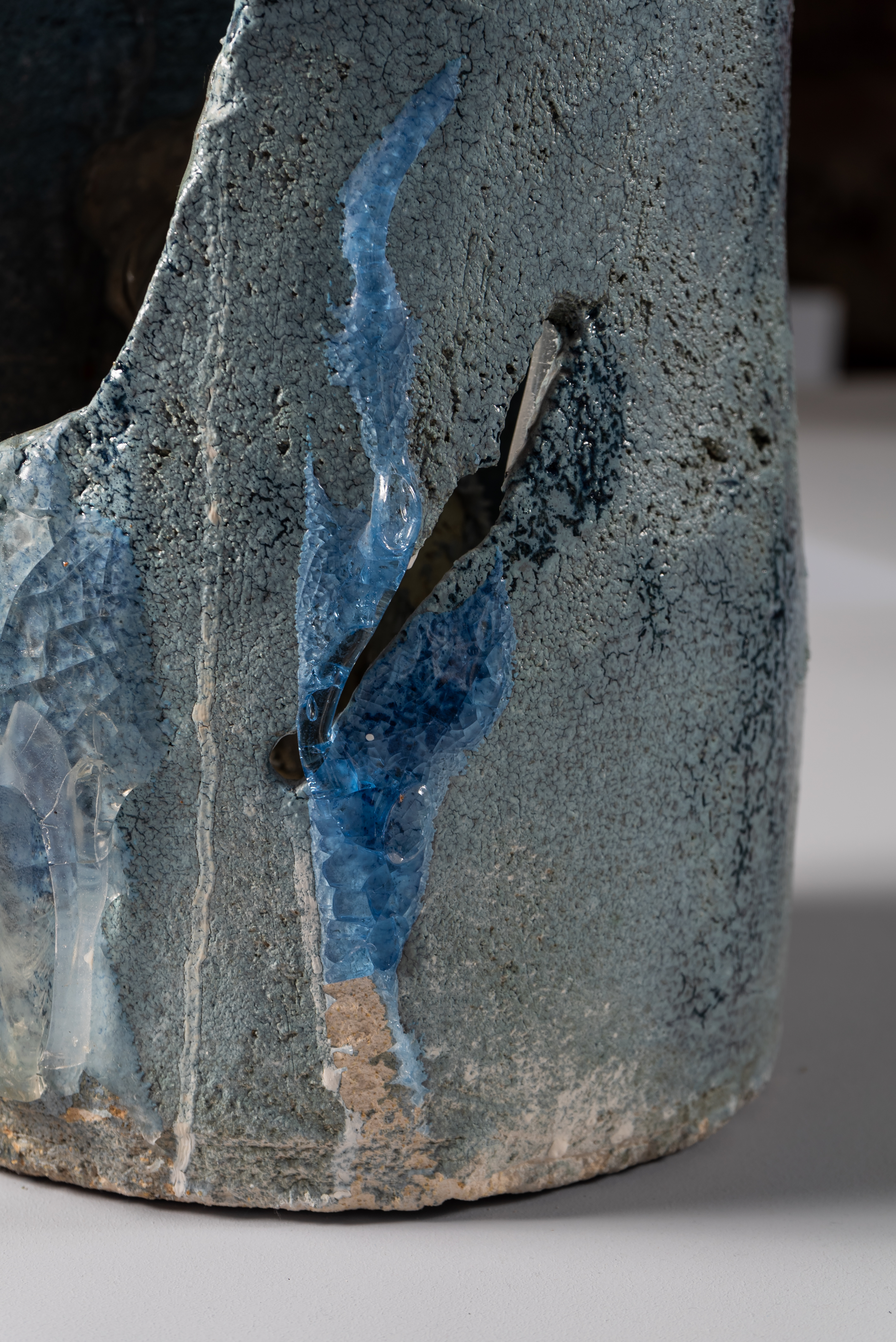 Using recycled objects in the process of creation, he follows his concept of re-interpretation of familiar materials. Extracting alternative properties from each material, the artist explores unconventional methods of developing form and finds new ways of interacting with the medium. The multi-layered texture is achieved through multiple firings. By placing glass in plaster moulds, he only guides the process of creation instead of controlling it. The plaster is burned off during the firing process, while the glass together with the ceramic moulds into a new form, which changes from a soft substance to a hard one. Objects that were discarded are experiencing a re-birth.