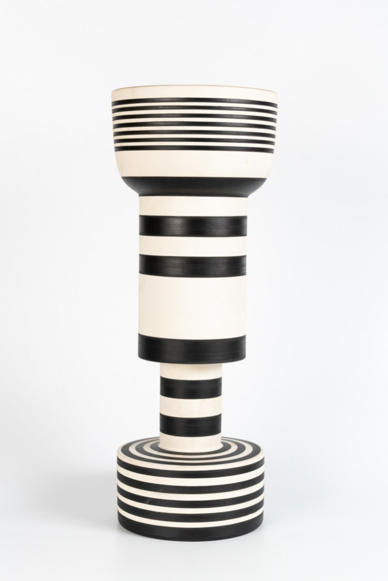 An Italian architect and designer known for his large oeuvre including furniture, jewelry, glass, lighting, and office design, Ettore Sottsass was also the founder in the early 1980s of the Memphis Group. Drawing inspiration from such movements as Art Deco and Pop Art, Memphis produced and exhibited furniture and objects that were vibrant in color and futuristic in design. Sottsass’ own work was known for its variety, oftentimes incorporating playfulness through ornamentation and color. His Olivetti typewriter (1969), one of his most celebrated designs, made of bright red-orange plastic, was a Pop phenom in both its functionality and innovative design. His architecture and design career spanned many decades and styles.