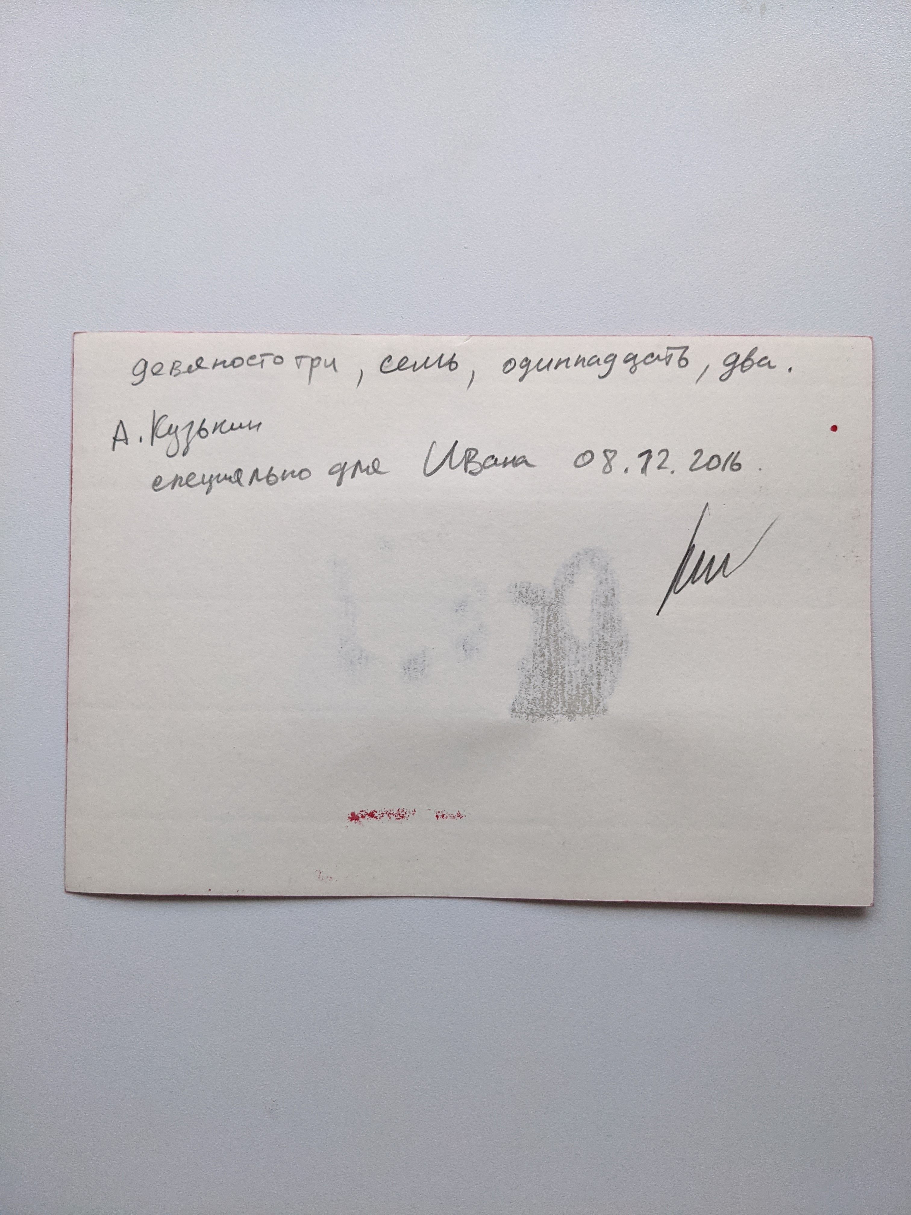 Andrey Kuzkin bestows on his father the right to convey a "very important message". A photograph of the artist Alexander Kuzkin at 30 is accompanied by the text: "You do not know me, I do not know you, but we look at each other and we hope for something else, which in itself is surprising." Messages coming from the past are still relevant for Andrey. He constantly returns to the question of "the conventionality of the value of art before the phenomena of time, life and death."