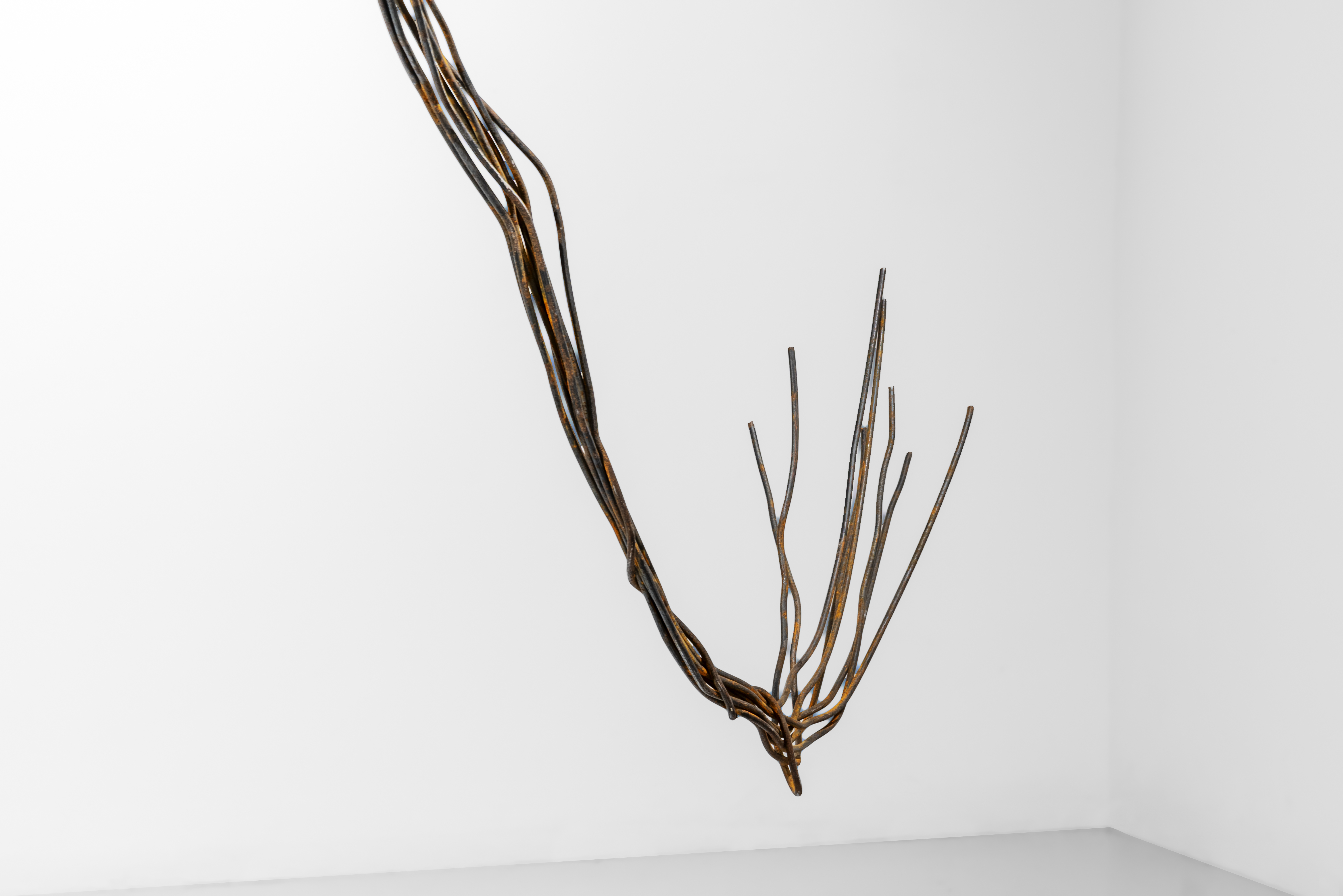 Однако то, что должно служить объединению и бесперебойной работе, поломано. Одни провода насильно разорвали, другие — смотали и повесили в ряд. Они так долго висят неиспользованные, что провисли под собственным весом и оборвались. Нынешняя серия скульптур больше не говорит о «связи всего со всем», как близкая по форме инсталляция «Коммуникации», которую художница сделала для 53-й Венецианской биеннале в 2009 году (тогда металлические провода продолжались в пространственной графике и иллюзорно оплетали весь павильон). Напротив — она обнажает вселенскую разобщенность, полость не каких-то отдельных вещей, а всего мира, который многочисленные коммуникации безуспешно пытаются соединить.