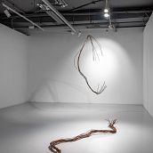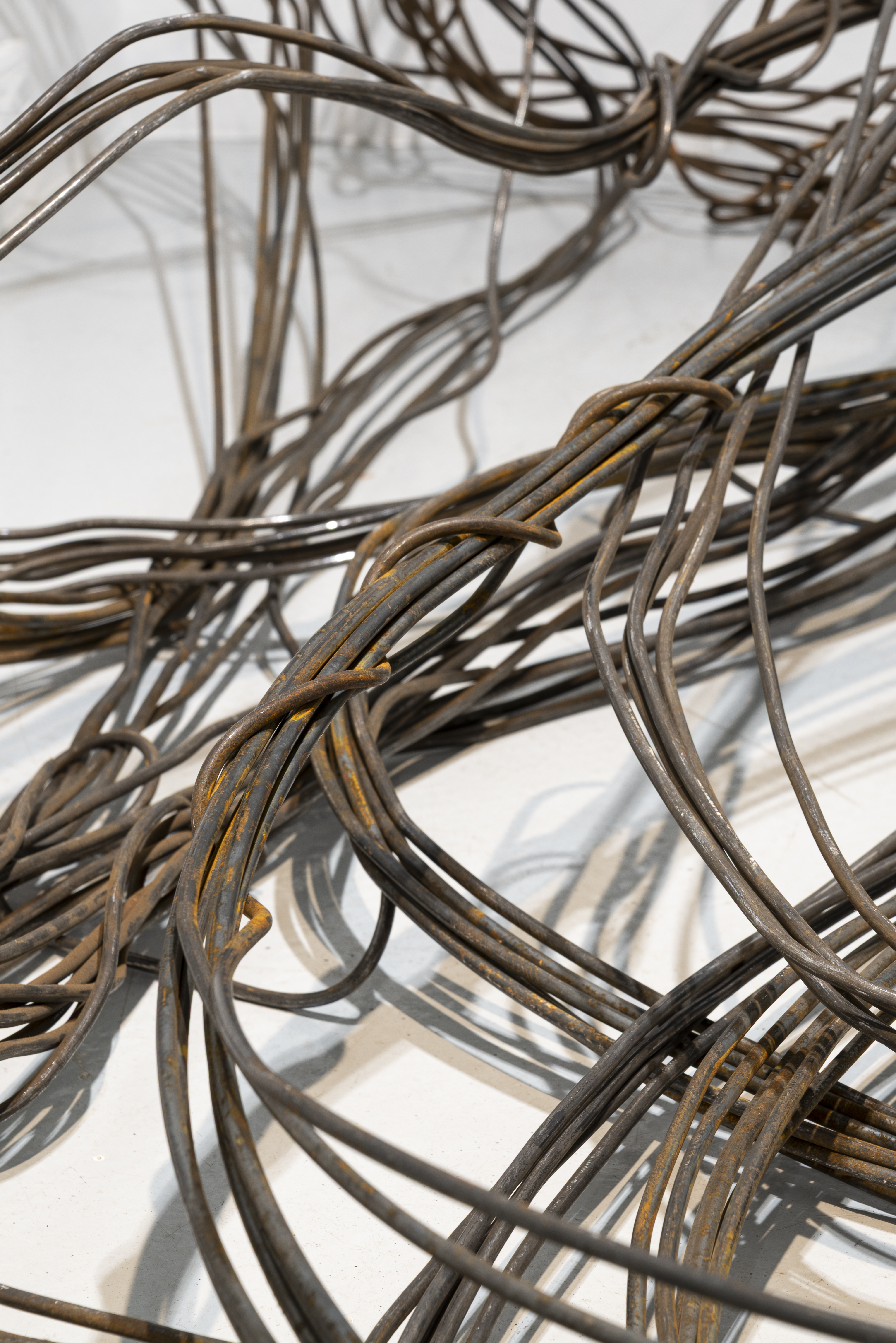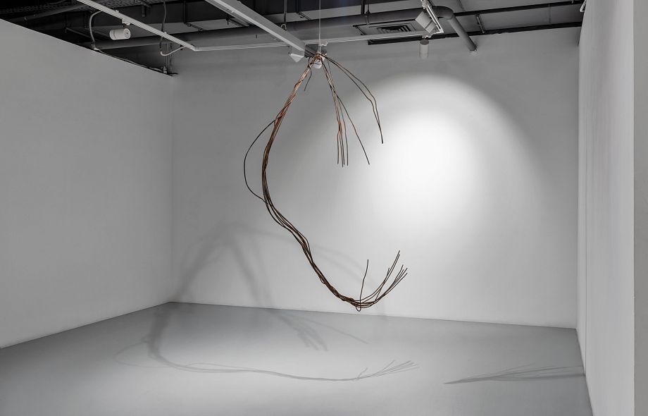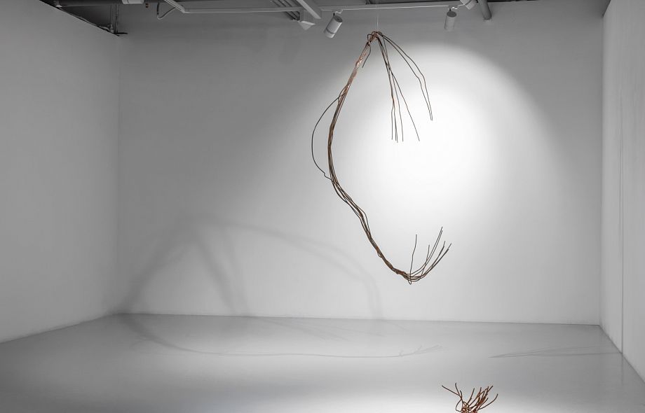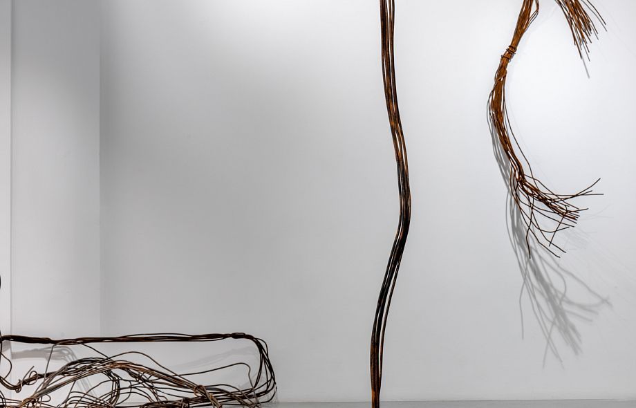 Такова и новая серия работ Ани Жёлудь. В этот раз, используя традиционный для себя материал — металлический прут, — художница отказалась от его привычной функции. Если раньше с помощью него она рисовала «контур» бытовых предметов (утюгов, чайников, кроватей, телевизоров), обнажая их пустотелость, материальную немощность, то теперь сам прут стал предметом — обыкновенным проводом.