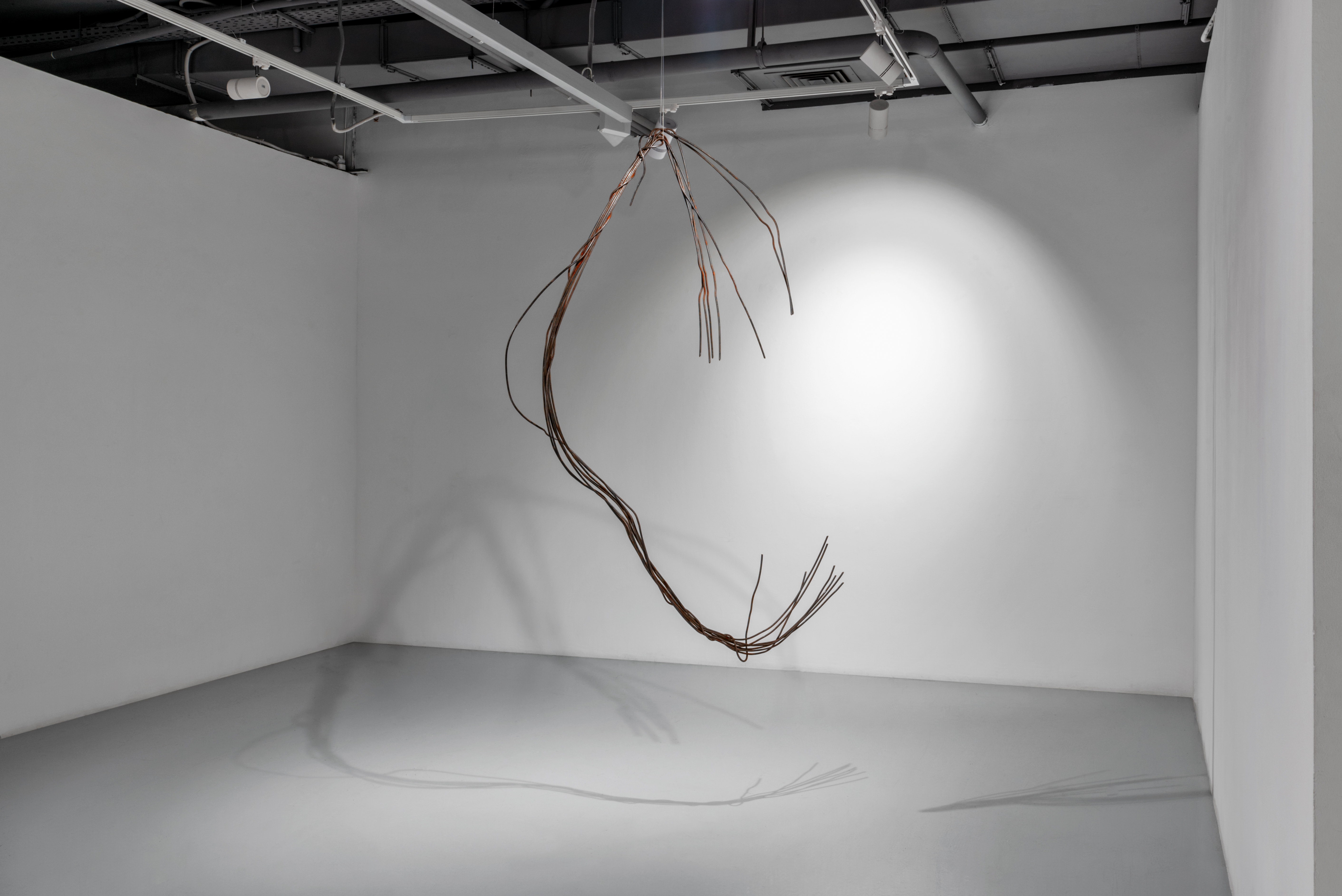Такова и новая серия работ Ани Жёлудь. В этот раз, используя традиционный для себя материал — металлический прут, — художница отказалась от его привычной функции. Если раньше с помощью него она рисовала «контур» бытовых предметов (утюгов, чайников, кроватей, телевизоров), обнажая их пустотелость, материальную немощность, то теперь сам прут стал предметом — обыкновенным проводом.