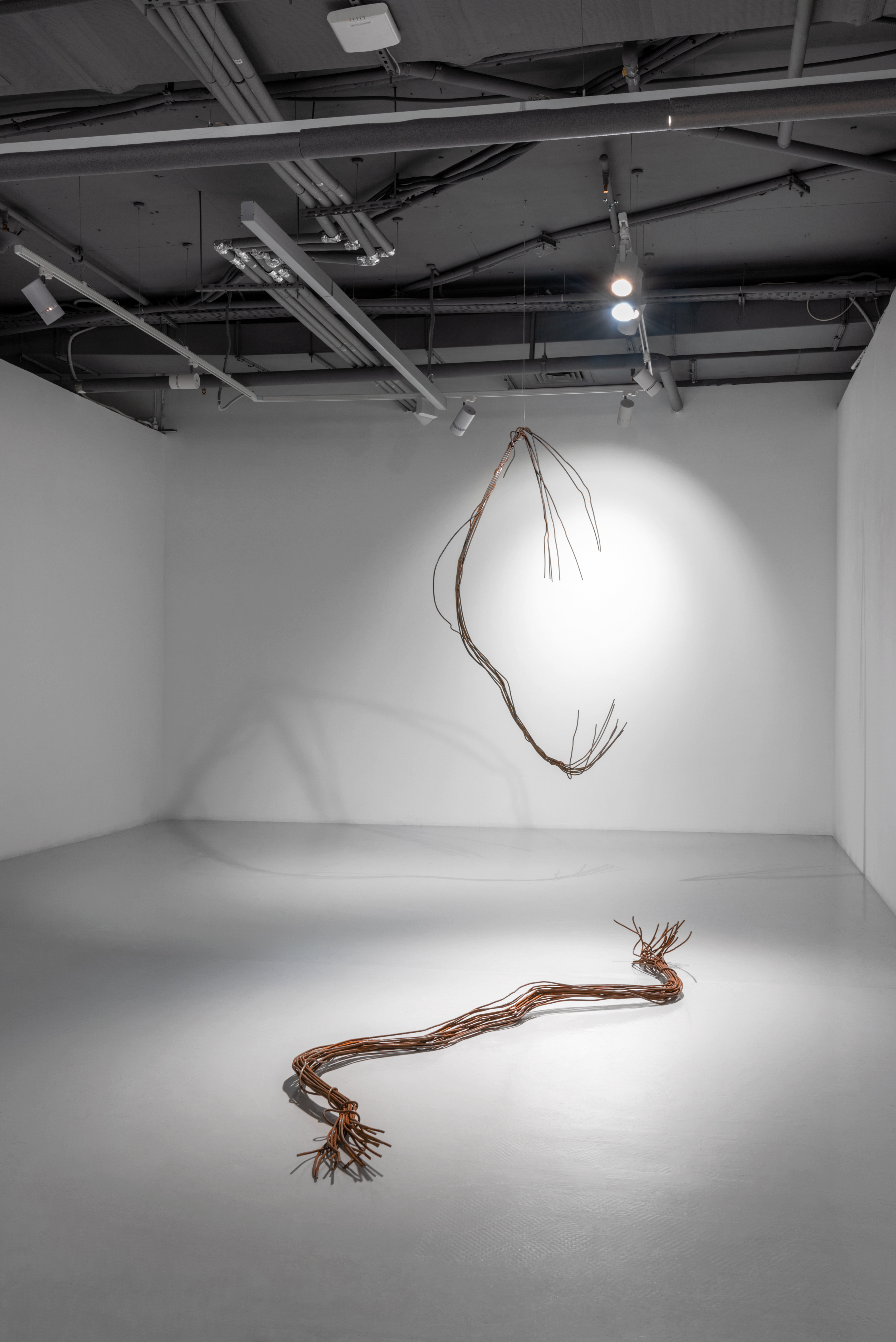 Однако то, что должно служить объединению и бесперебойной работе, поломано. Одни провода насильно разорвали, другие — смотали и повесили в ряд. Они так долго висят неиспользованные, что провисли под собственным весом и оборвались. Нынешняя серия скульптур больше не говорит о «связи всего со всем», как близкая по форме инсталляция «Коммуникации», которую художница сделала для 53-й Венецианской биеннале в 2009 году (тогда металлические провода продолжались в пространственной графике и иллюзорно оплетали весь павильон). Напротив — она обнажает вселенскую разобщенность, полость не каких-то отдельных вещей, а всего мира, который многочисленные коммуникации безуспешно пытаются соединить.