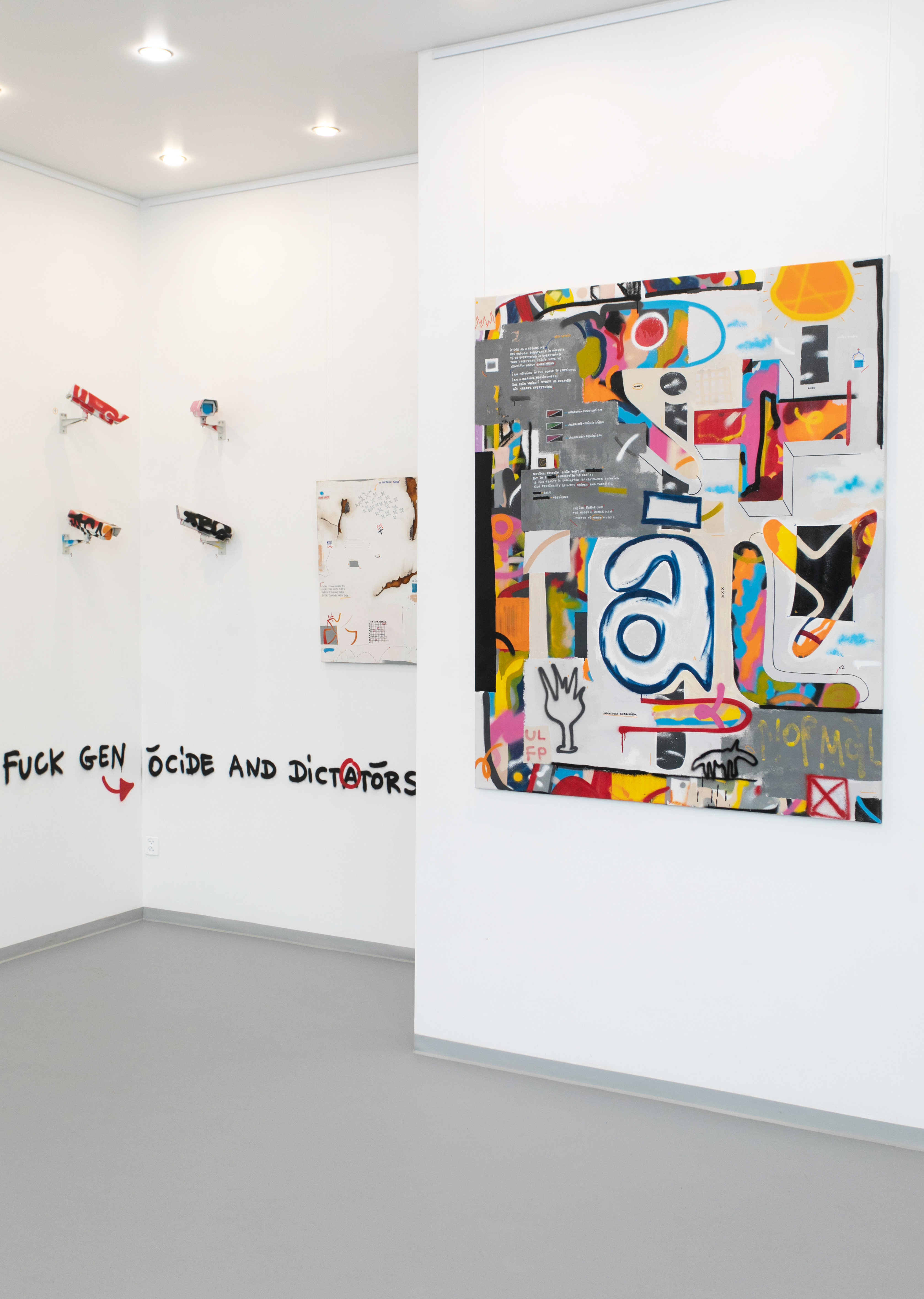 манифест контркультуры, встающий на защиту тех, кого лишили права голоса в попытке спасти субъективную суверенность. Словно человек, оказавшийся в начале мироздания, первый из Homo Ludens, Александр Кипсоне перевоплощается в собственного лирического героя-анархиста. Его размышления о свободе и подчинении, социальном одобрении и идеалах, всеобъемлющем святом духе и внутренней пустоте складываются в протестное послание художника, зашифрованное в абстракции. В стройных конспектах, изящно вписанных в композиции холстов, Александр с дотошностью исследователя проводит анализ ограничивающих сущностей: культурных, религиозных, общественных — всех тех, что с раннего детства определяют траекторию личного падения в обыденность. И к каждому из этих пунктов тут же находит примеры свободной спонтанной жизни, вдохновляясь софистами, анархистами и даже святыми. Его работы — не риторически экспрессивный манифест, это игра слов и со словами, которые формируют нашу реальность и определяют сознание, стремящееся освободиться от заученных схем. Цитаты, переплетающиеся с эклектично составленным потоком слов и ругательств, постоянно меняют интонацию, вторя созидательным или деструктивным настроениям автора. Александр то покрывает холст множеством красочных слоев, то прожигает его.