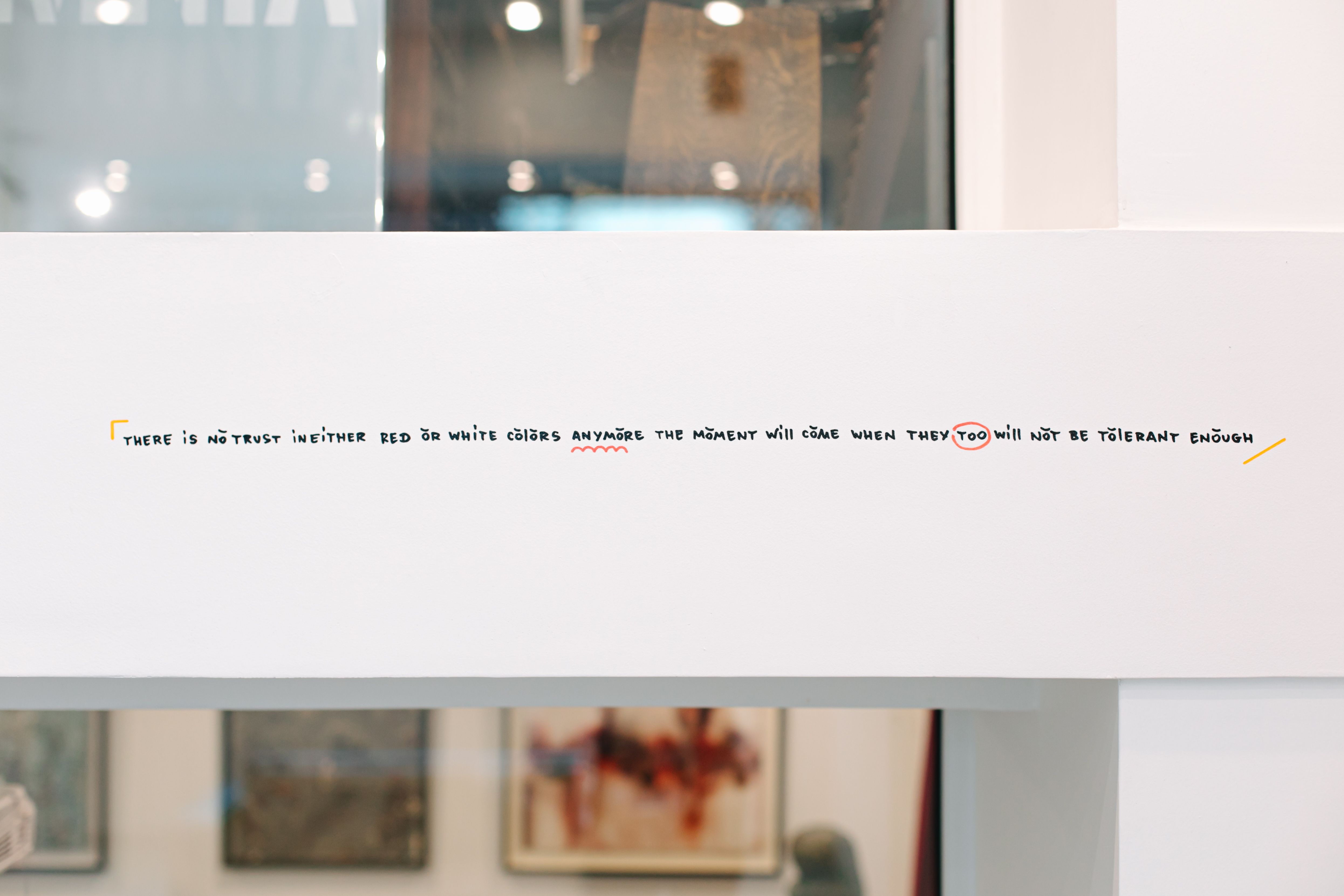 Хаотично раскидывая по выставочному залу символы и тексты, выстраивая между произведениями и зрителем призрачные барьеры и настраивая прирученные тегами камеры видеонаблюдения, художник приглашает к игре, главное правило которой — довериться себе и не бояться проиграть. Ведь как гласит одна из работ, "The old honor God. The modern honor man. I prefer trust myself". Вне зависимости от внешних обстоятельств и норм свобода быть собой внутри каждого.