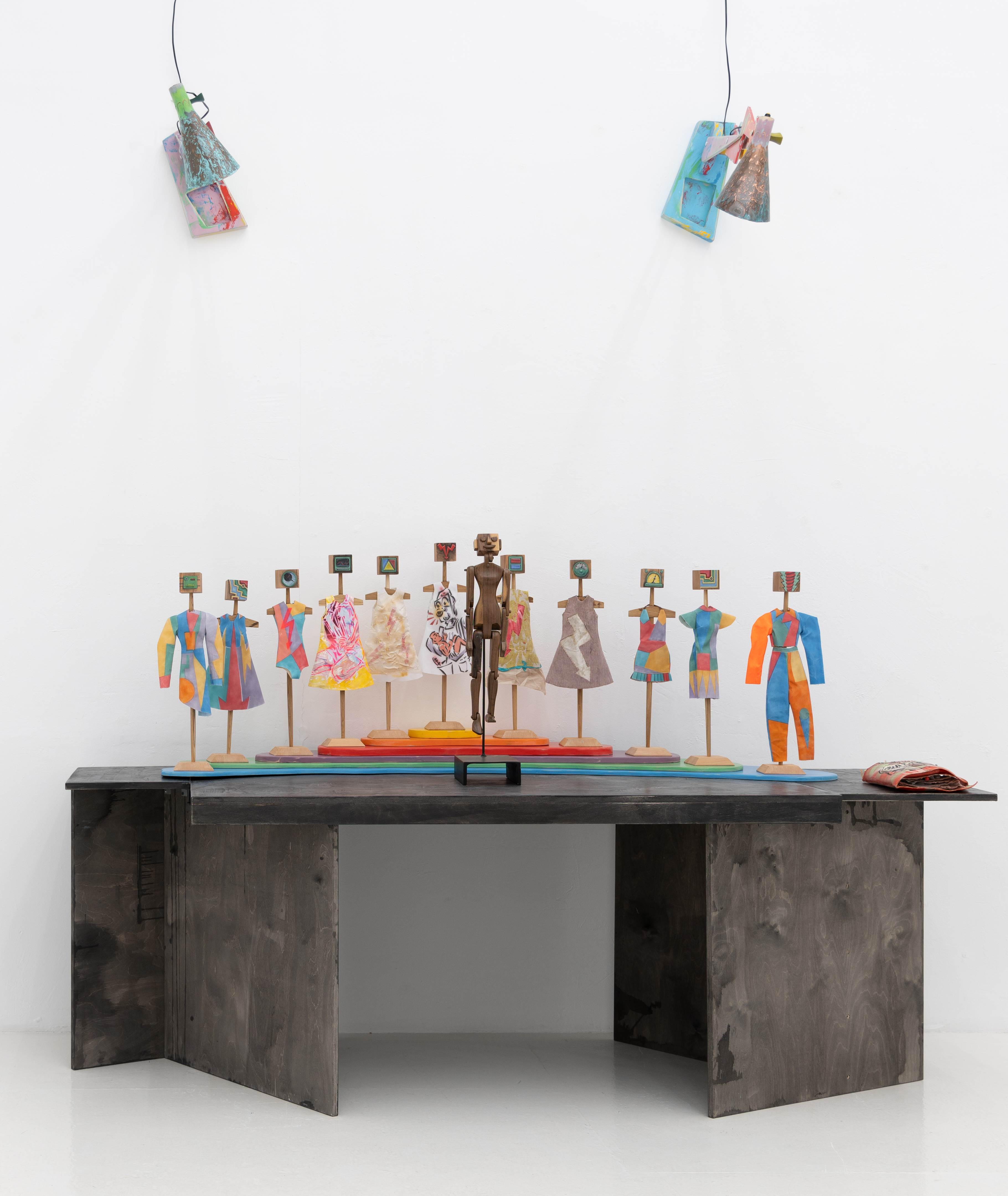 Хранилище архива документов и одновременно светильник в виде той же молнии - повторяющийся орнамент на одежде роботов. Одежды представлена целая коллекция в человеческом и миниатюрном, кукольном размере. «От-фютюр» остроумное название этой коллекции. Керамические рельефы с бытовыми сценами из жизни роботов, столы, стулья, настольные лампы, часы, барометры с одинаковым успехом могут быть востребованы и в человеческом быту, и в будущем мире роботов искусственного интеллекта. Эстетика супрематизма в современном контексте и узнаваема и авангардна для современного зрителя. Скульптура «робоскрепы» — механический светильник в виде семьи роботов, которая повторяет человеческую семью, выполнена с применением современных технологий и материалов. Гуманизация роботов, попытки художника внедрить ИИ в творчество, предлагают зрителю погрузиться в реальную жизнь будущего, воображаемого художником. А художники, как показывает опыт человечества, имеют провидческие свойства.
