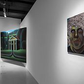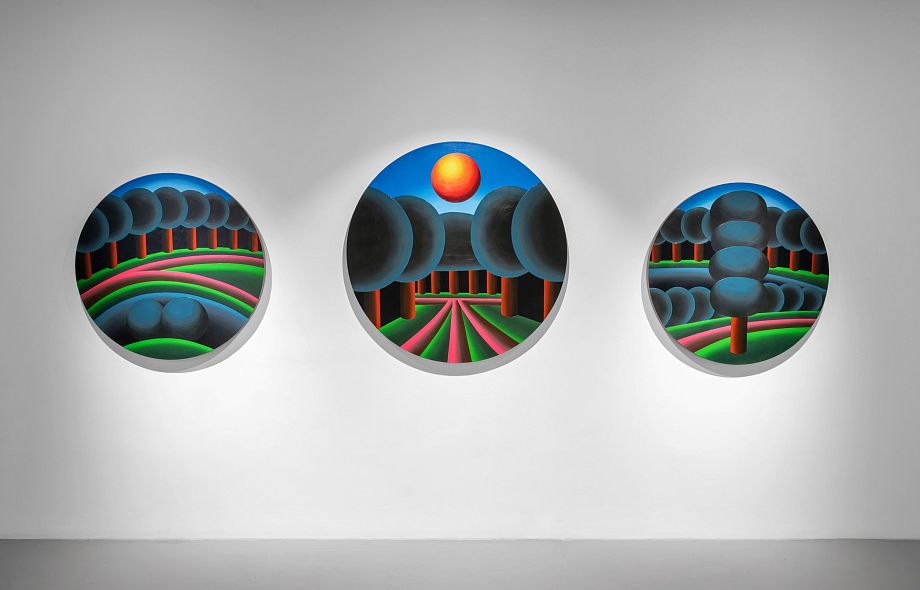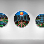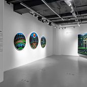Второе качество оптики Хвостова — серийность. Его образы не замыкаются отдельными произведениями, но повторяются, генерируются потоком, в котором автор непрерывно ищет, оттачивает собственную технику. Предъявляемая им модель мира, в целом, уже знакома зрителям по прошлым выставкам: контрастные градиентные цвета, геометрически выверенные композиции, однородные фоны. И одновременно насыщенная чувственность, соблазнительность образов при общей холодности, «диджитальности» палитры. Это по прежнему очевидно мягкий, упругий мир, которому нипочем внешние интервенции.