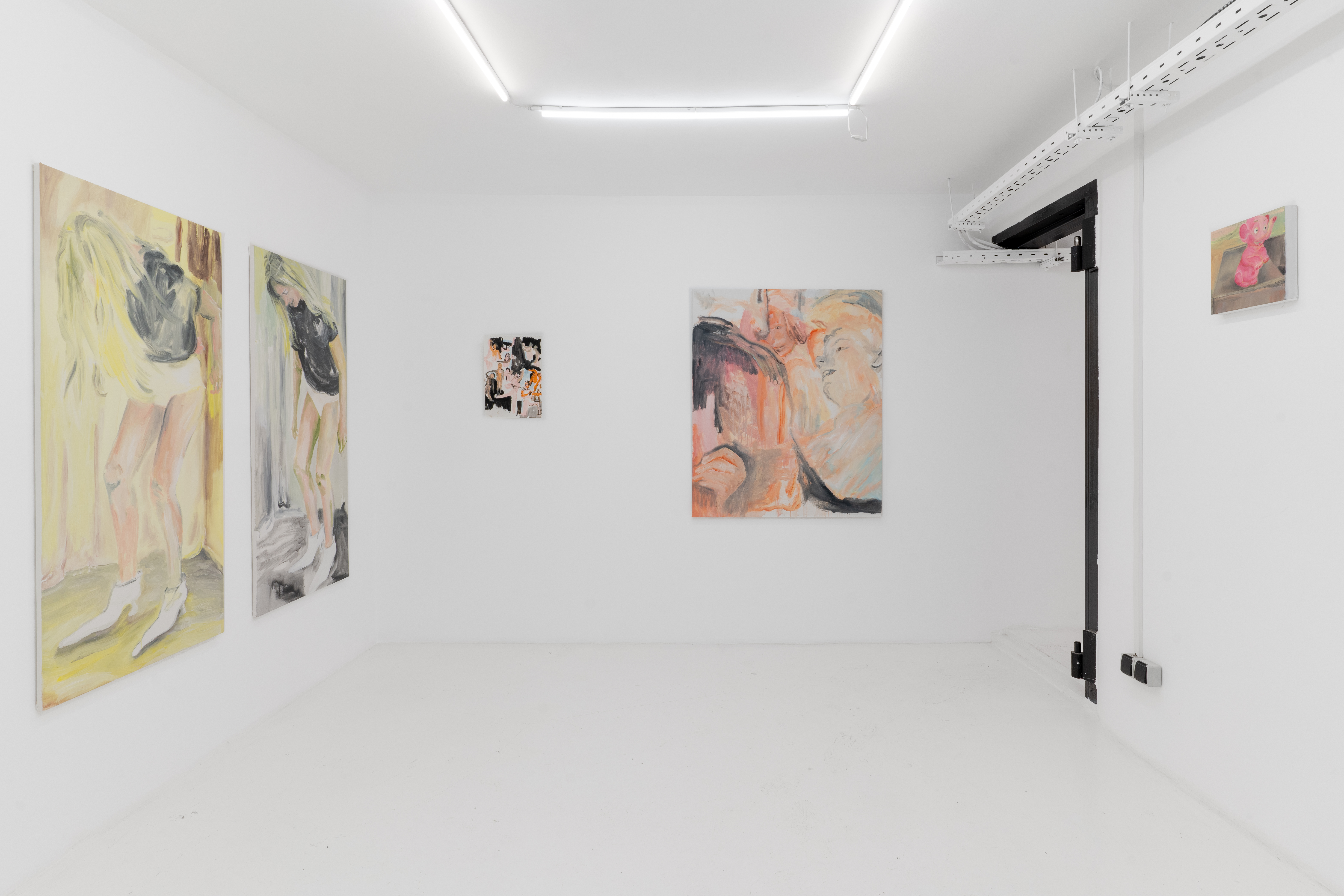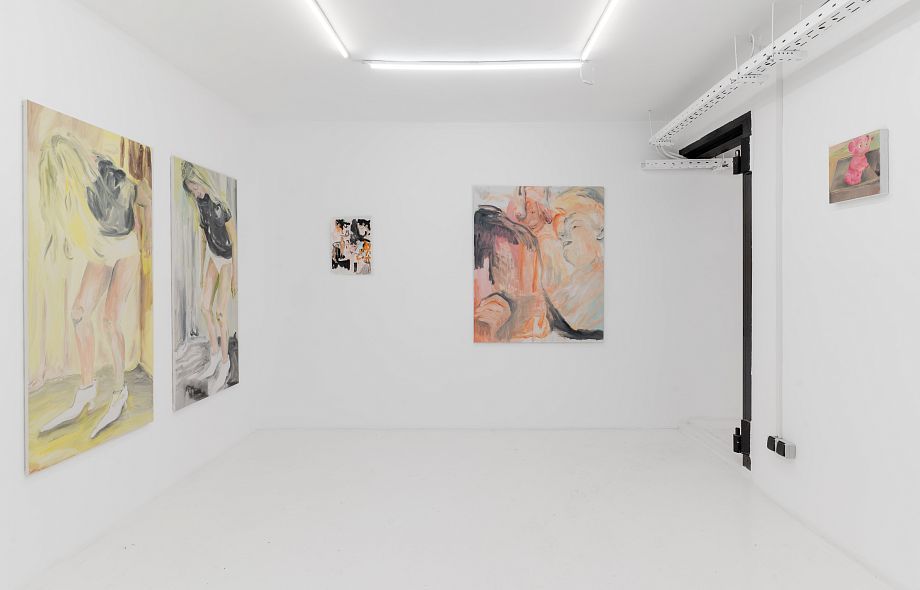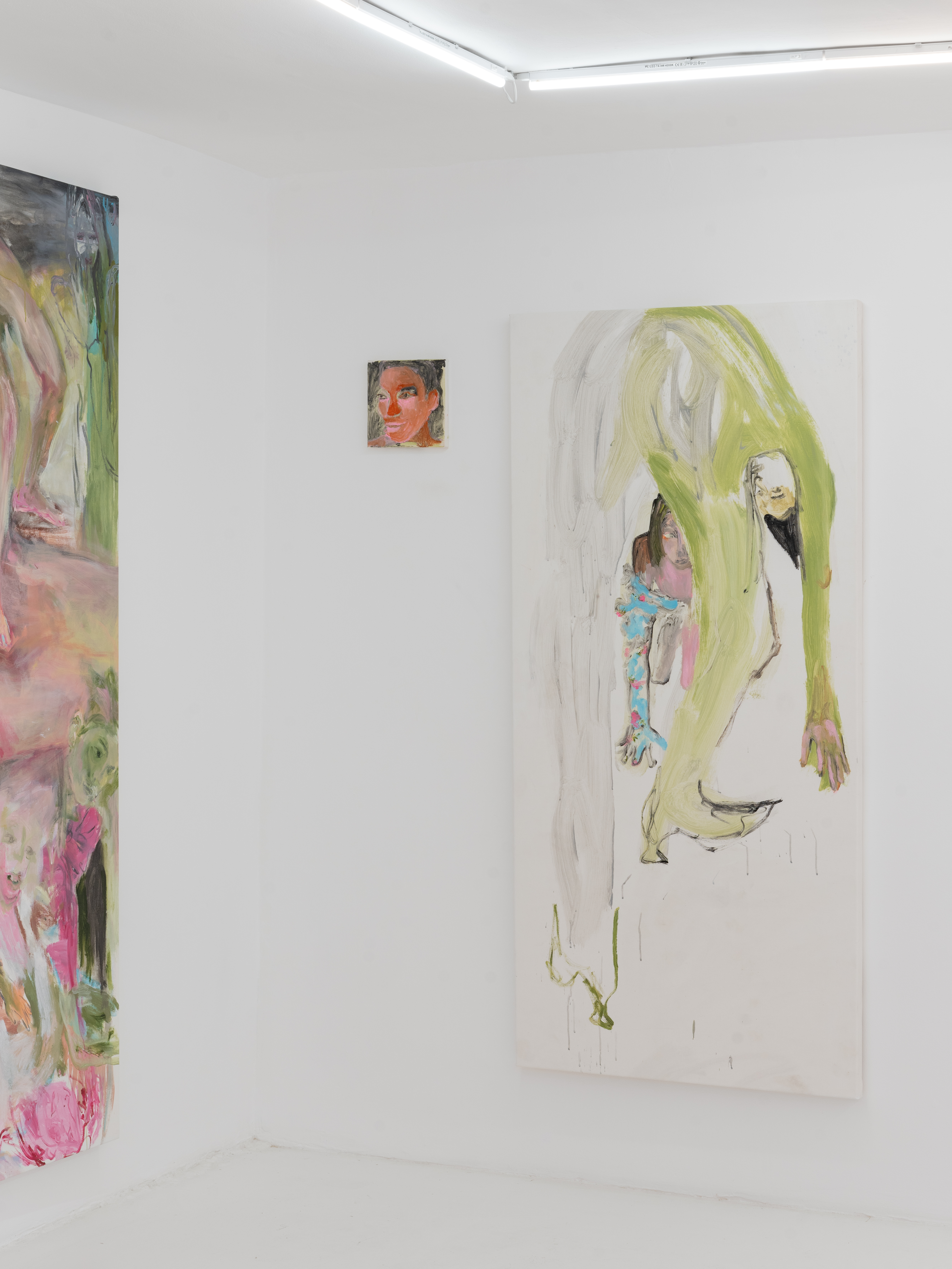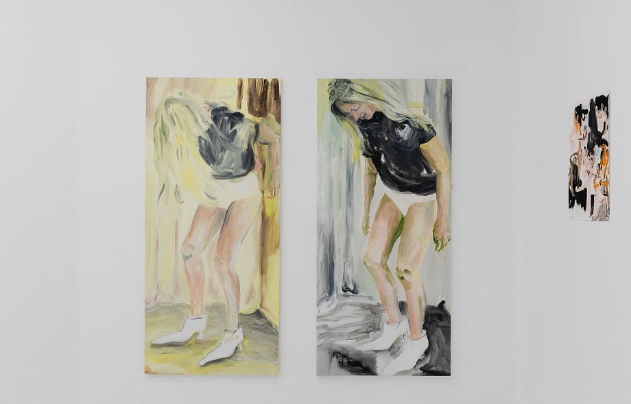 Новые работы Австрейх написаны в палитре от ярких оттенков желтого и розового до глубокого черного, сосредоточены на человеческой фигуре, построенной из слоев вибрирующей краски. Ее свободные жесты затушевывают однозначное прочтение, поскольку тела рассыпаются на беспокойную и местами неуловимую активность. Разрозненные по воле художницы фрагменты предлагают нелинейную форму повествования внутри проекта, тщательно сконструированную, но остающуюся личной, как будто вы хаотично пролистываете заметки или дневник.