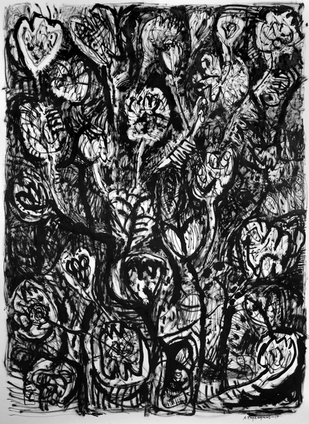 A superb graphic artist, working in a vast array of techniques. His paintings borrow the jagged, broken, and intense lines of drypoint. The subjects in his works are mere images, behind which something more can be discerned—the fluidity of human emotions. The author's established and recognizable visual language possesses a distinctive "disharmonious harmony," an organic chaos that almost becomes abstract.