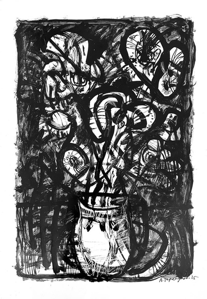 A superb graphic artist, working in a vast array of techniques. His paintings borrow the jagged, broken, and intense lines of drypoint. The subjects in his works are mere images, behind which something more can be discerned—the fluidity of human emotions. The author's established and recognizable visual language possesses a distinctive "disharmonious harmony," an organic chaos that almost becomes abstract.