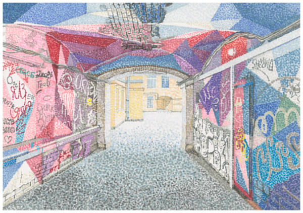 Lyuba Obraztsova reinvents pointillism by breaking down the world around her into atoms. Lyuba graduated from the Roerich Art School and worked for some time as a restorer. She strengthened her theoretical foundation at the Academy of Arts. Since 2020, she has been a member of the New Urban Artists collective.