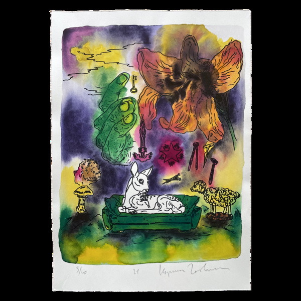 Works in watercolor, collage, silk-screen printing, engraving.