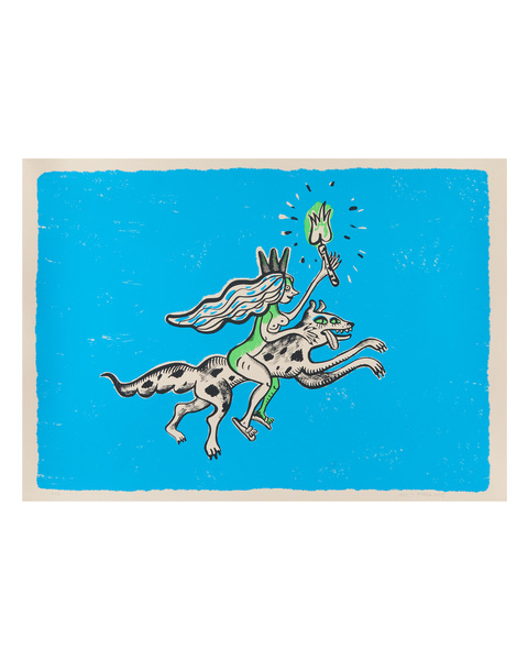 Несущаяся на волчице женщина инстинктивно связана с природой дикой частью своей натуры. Освещая бесконечную пустоту синевы, она возникает на небе тогда, когда мы хотим признаться в любви к стихиям. Что может быть гуманнее, чем огонь, воздух и вода?